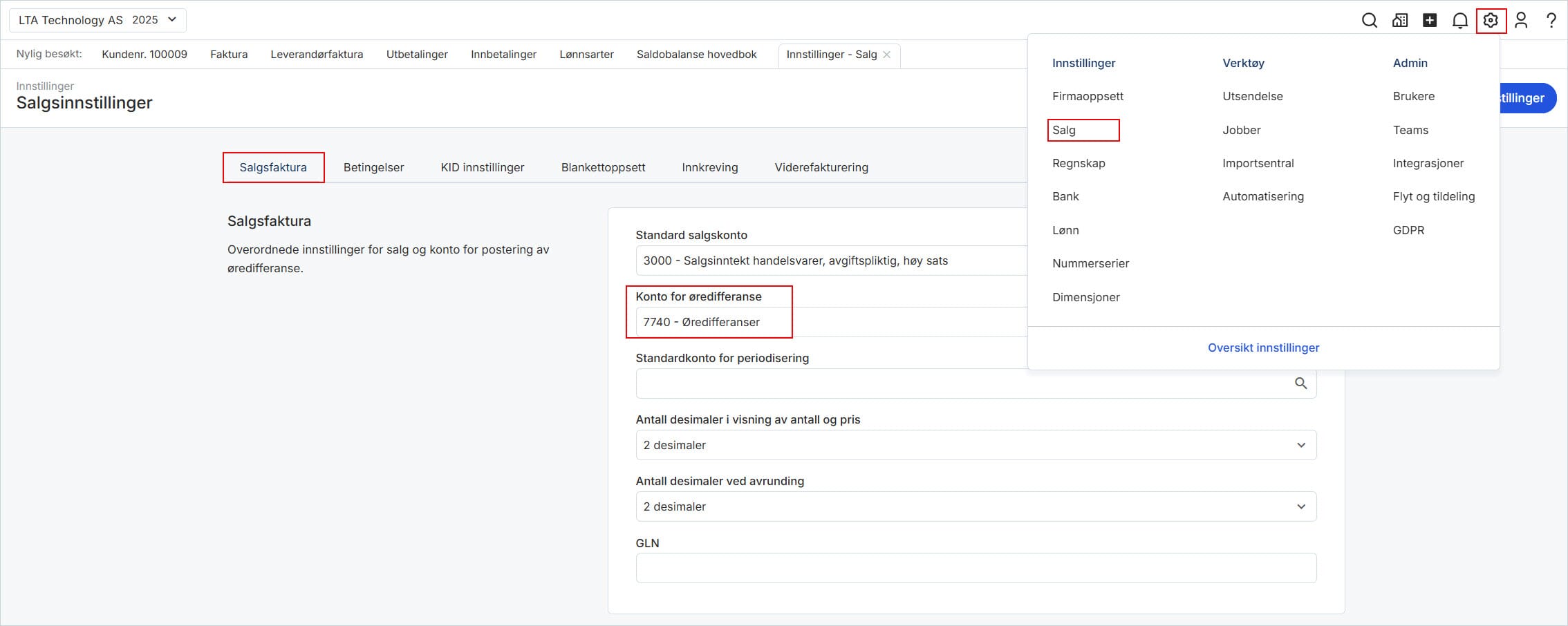 Hvis du ønsker å endre standardkonto for øredifferanse, går du til Innstillinger i toppmenyen, Salg og Salgsfaktura.