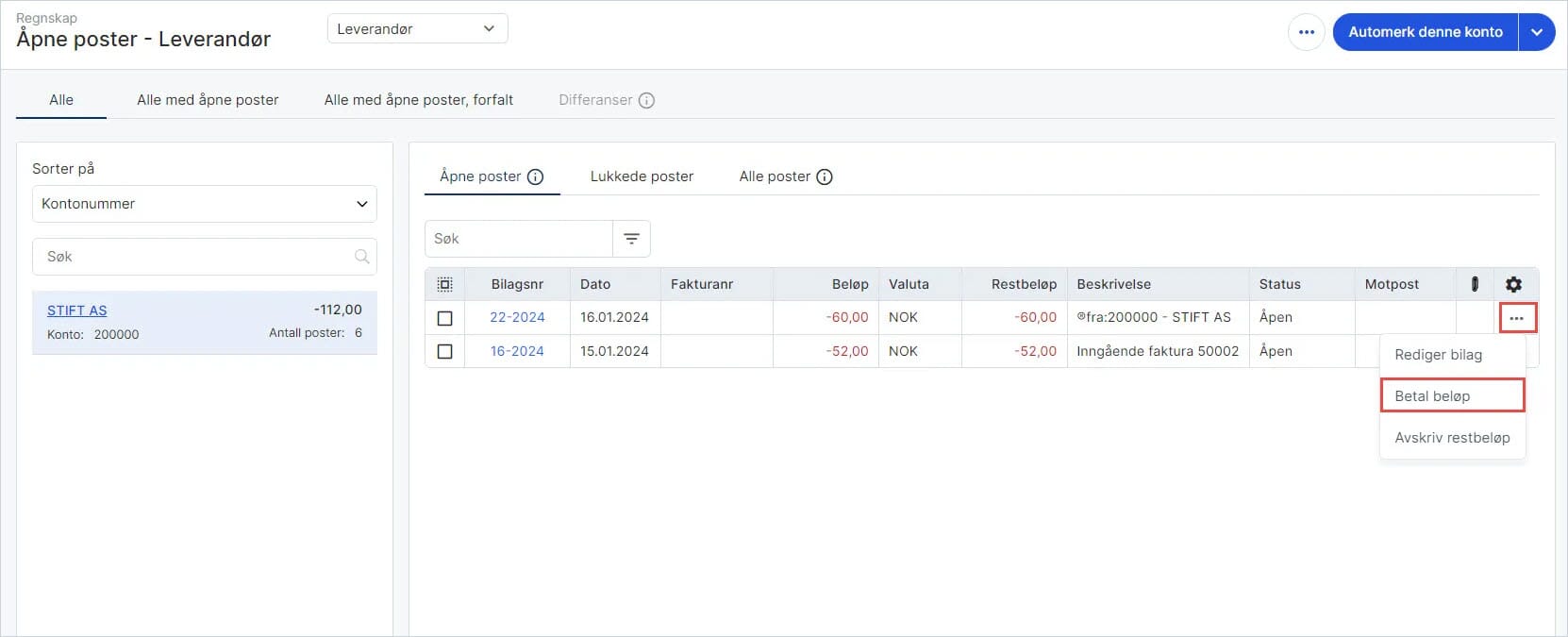 1. Gå til Regnskap i venstremenyen og velg Åpne poster