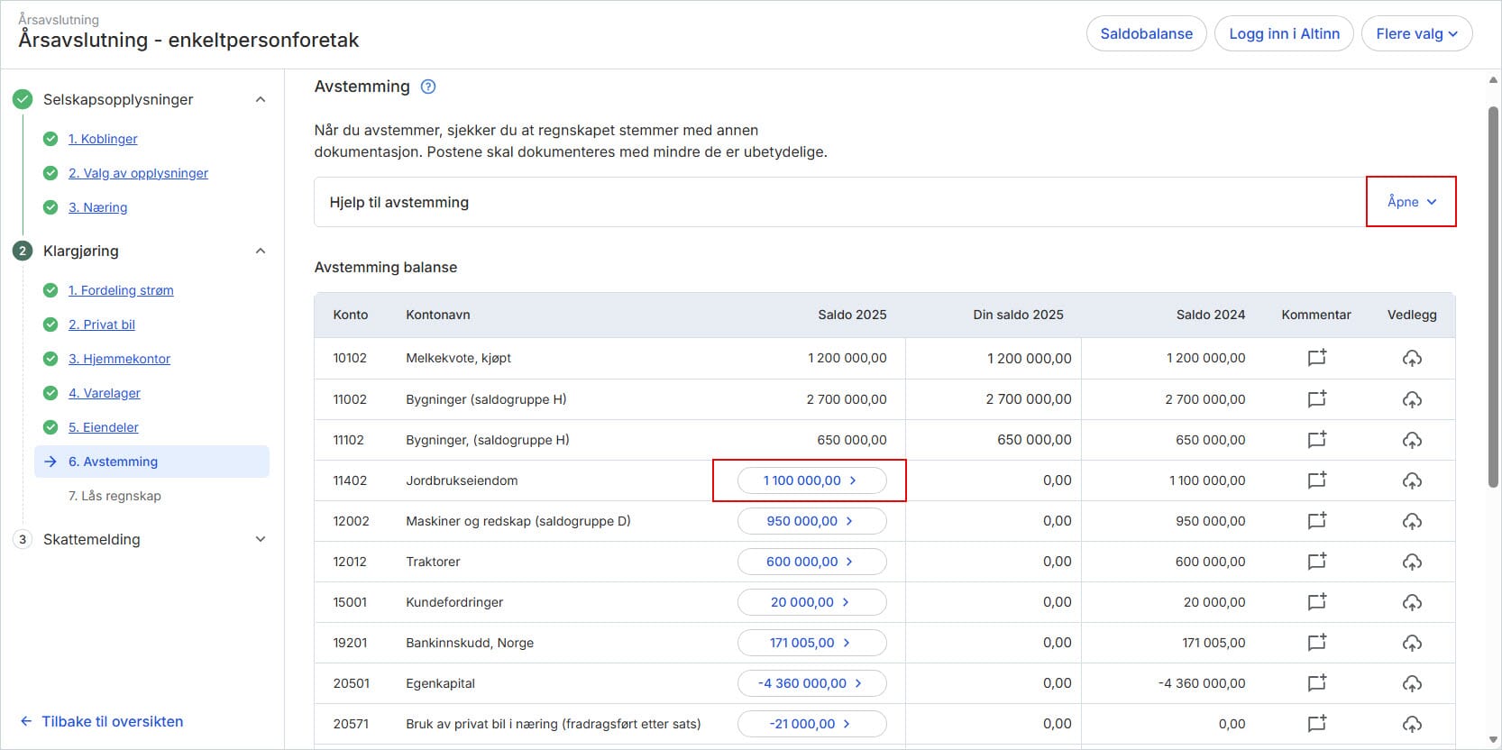 Balansen må dokumenteres, men det er ikke et obligatorisk steg for å kunne fullføre årsavslutningen. Vårt skjema for avstemming vil imidlertid hjelpe deg om du ikke har dokumentert balansen på en annen måte. Vi anbefaler deg å bruke god tid på dette.