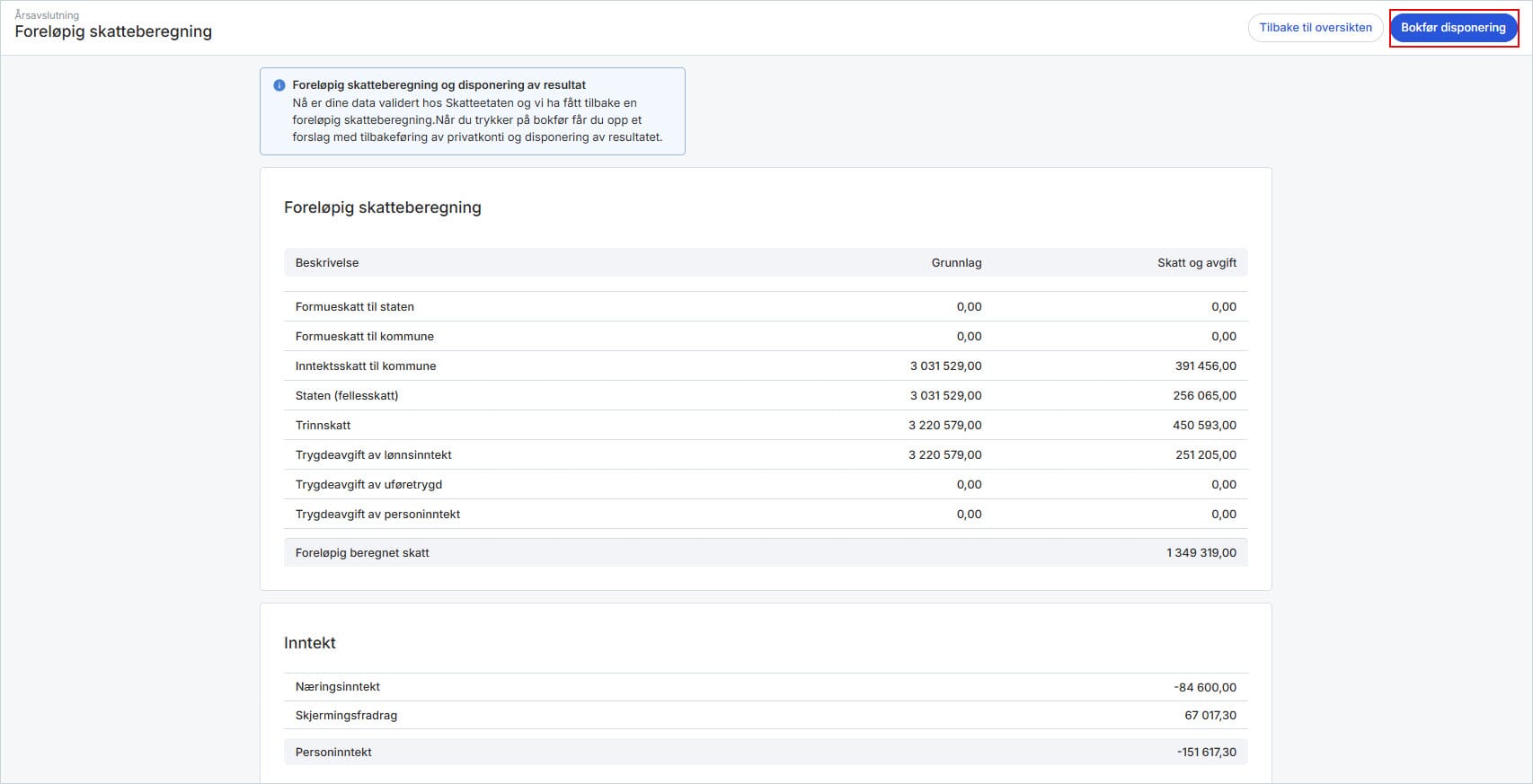 Når du klikker på Bokfør disponering, vil du få opp et forslag med tilbakeføring av privatkontoer og disponering av resultatet. Se over at det ser fint ut, og klikk på Bokfør.