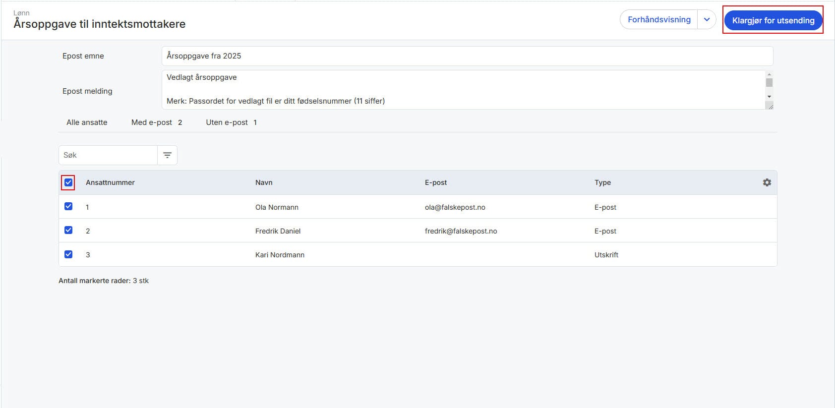 Dersom det finnes ansatte som ikke har e-postadresse definert i ansattkortet, vil systemet foreslå å skrive ut årsoppgaven for disse.