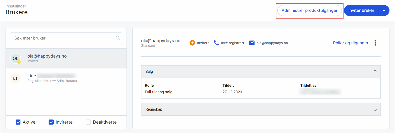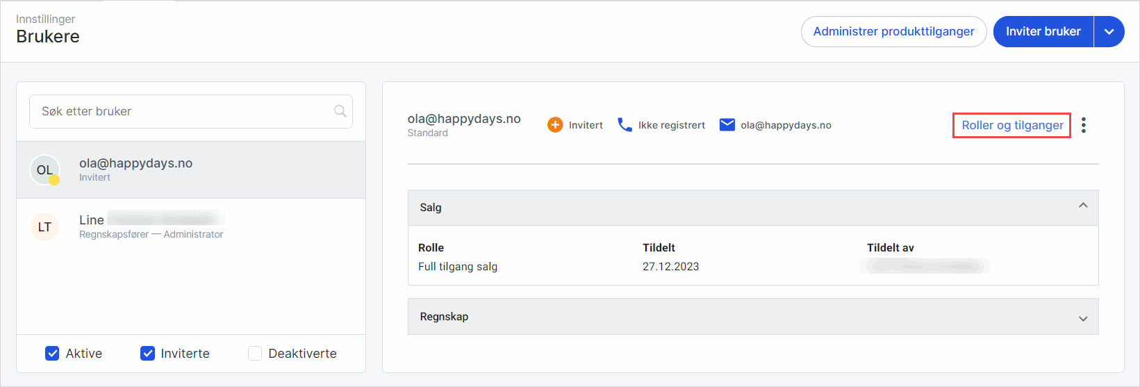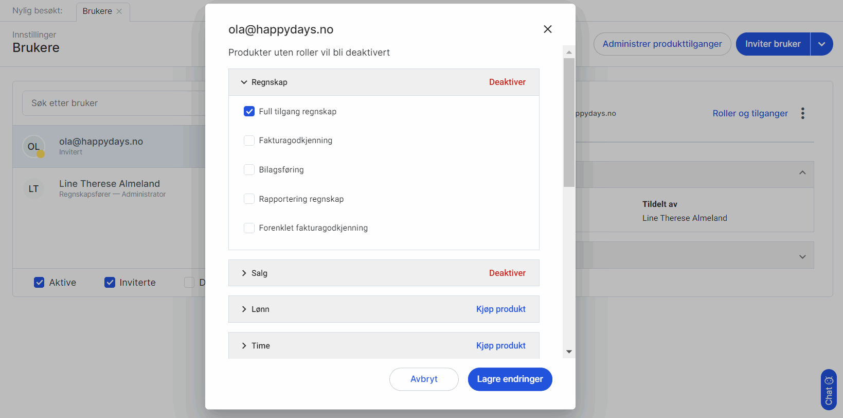Dersom du ønsker å administrere en rolle på brukernivå, klikker du på den aktuelle brukeren og Roller og tilganger. Klikk på Kjøp produkt for det produktet du ønsker, og tildel deretter de aktuelle rollene du ønsker at brukeren skal ha. Du kan deaktivere tilgangene til en bruker enten ved å klikke på Deaktiver eller ved å fjerne haken ved aktuell tilgang. Husk å lagre endringene.