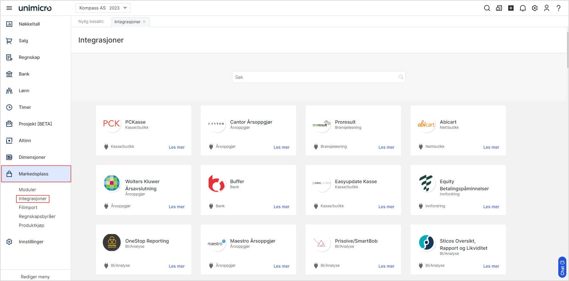 Vi tilbyr mange tredjepartsløsninger til regnskapssystemet. Gå til Markedsplassen i venstremenyen og velg Integrasjoner.