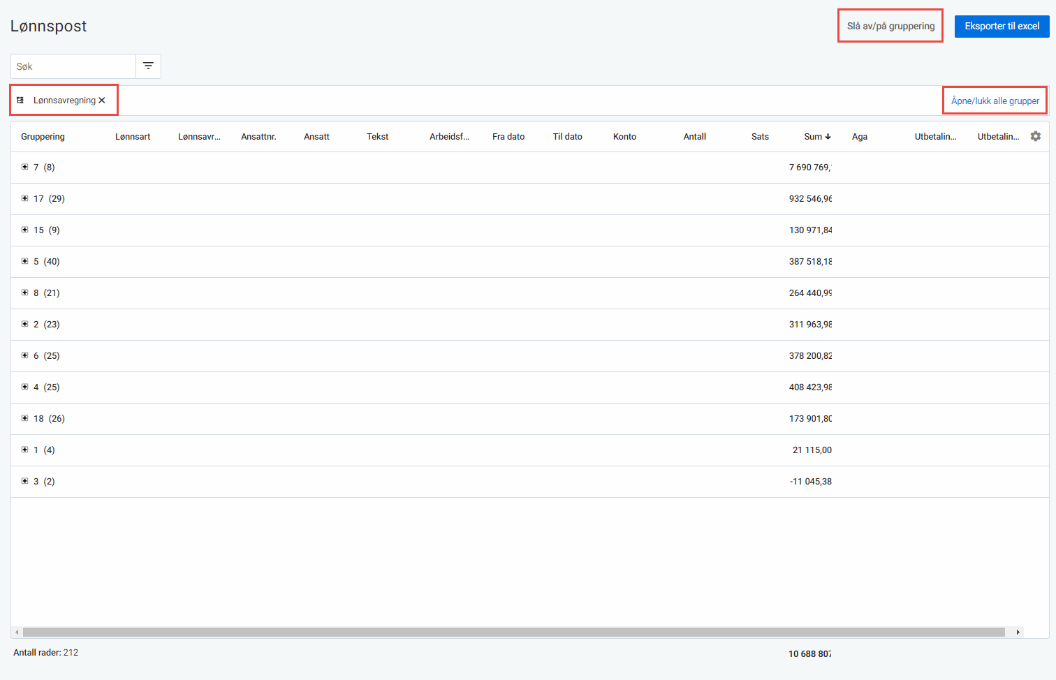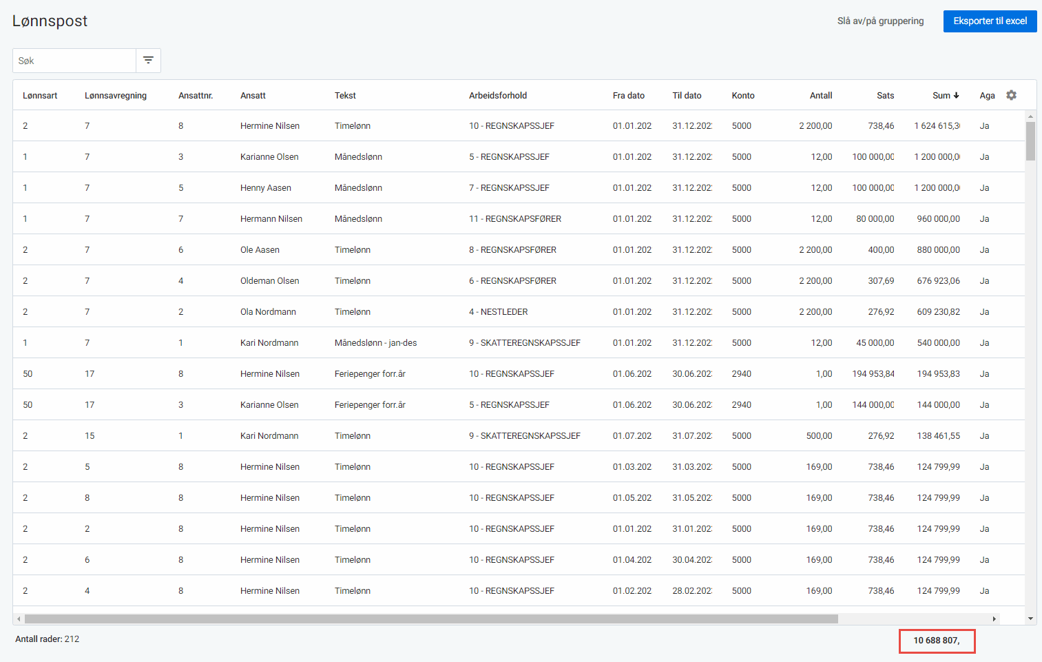 Tips til filtrering: For å vise alt som er med i grunnlag for arbeidsgiveravgift, velg Aga er Ja. Hvis du ønsker å filtrere på a-meldingsperiode velg Utbetalingsmåned.