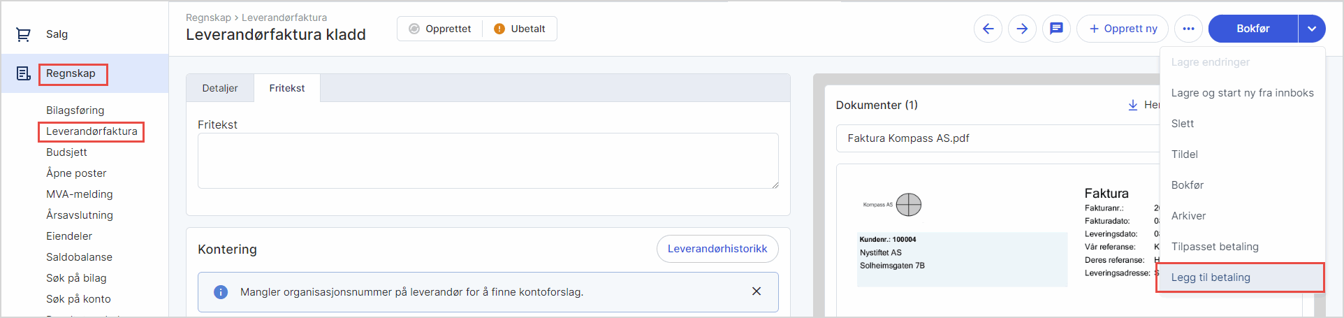 1. Gå til Regnskap i venstremenyen og velg Leverandørfaktura.