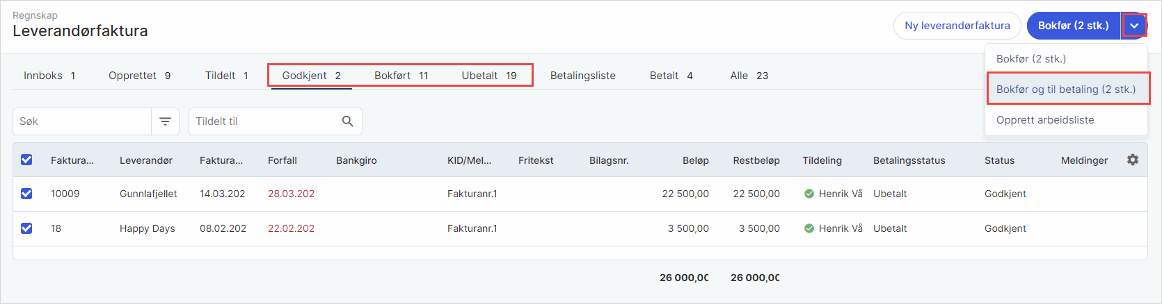 3. Hvis du er på fanen Godkjent, klikker du på pil ned og velger Bokfør og til betaling. Betalingene blir da bokført og sendt direkte til betalingslisten.