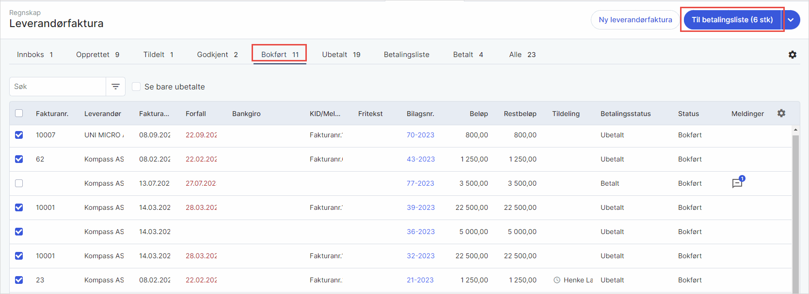 Er du på fanen Bokført eller Ubetalt, klikker du på Til betalingsliste.
