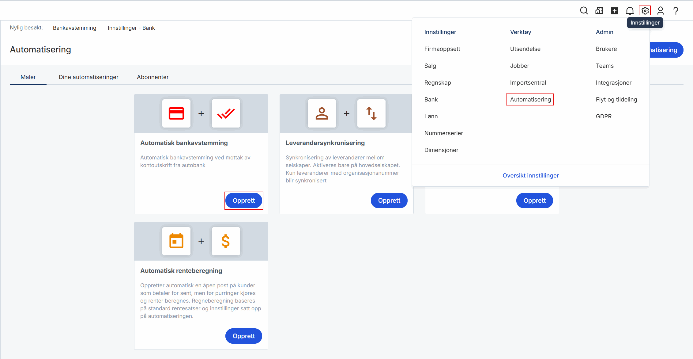 Dette setter du opp ved å gå til Innstillinger i toppmenyen, Automatisering og Opprett under Automatisk bankavstemming.