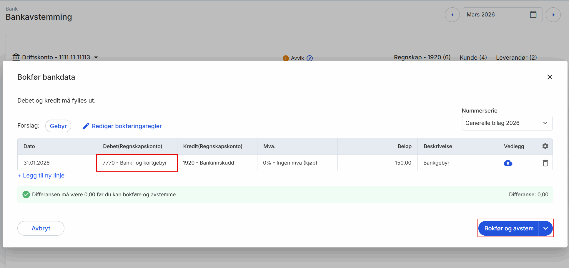 2. Legg inn motkonto 7770 - Bank og kortgebyr under debet, og klikk på Bokfør og avstem.