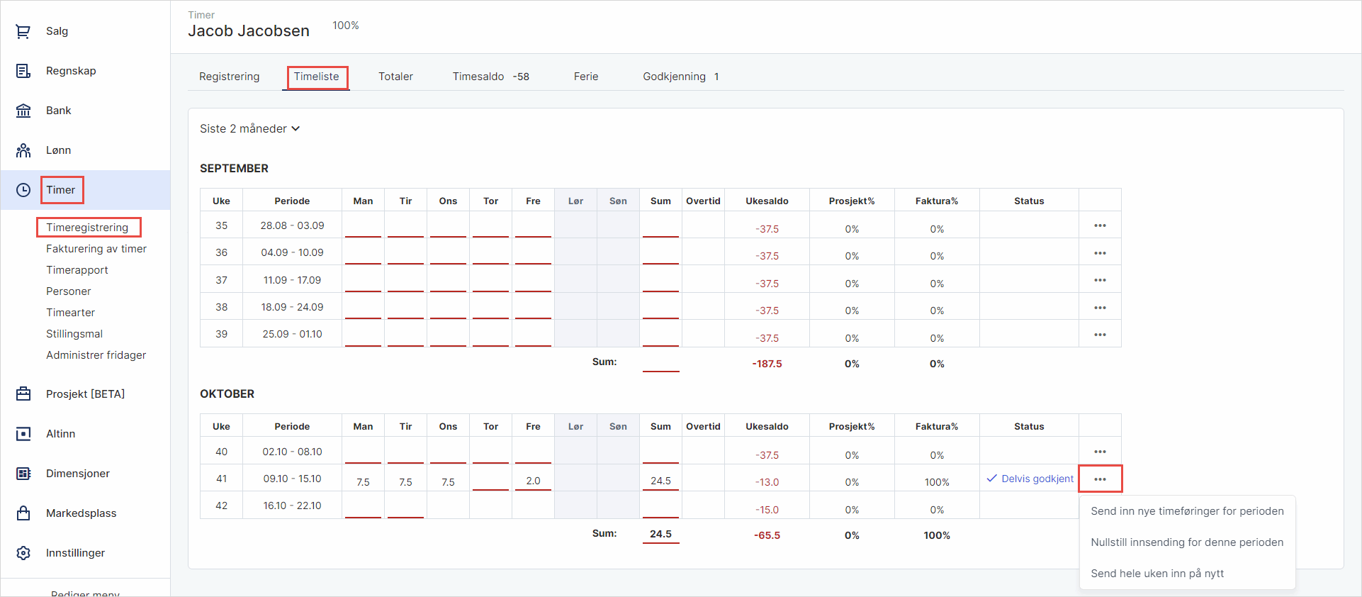 - Nullstill innsending. Da kan du redigere samtlige dager i valgt uke