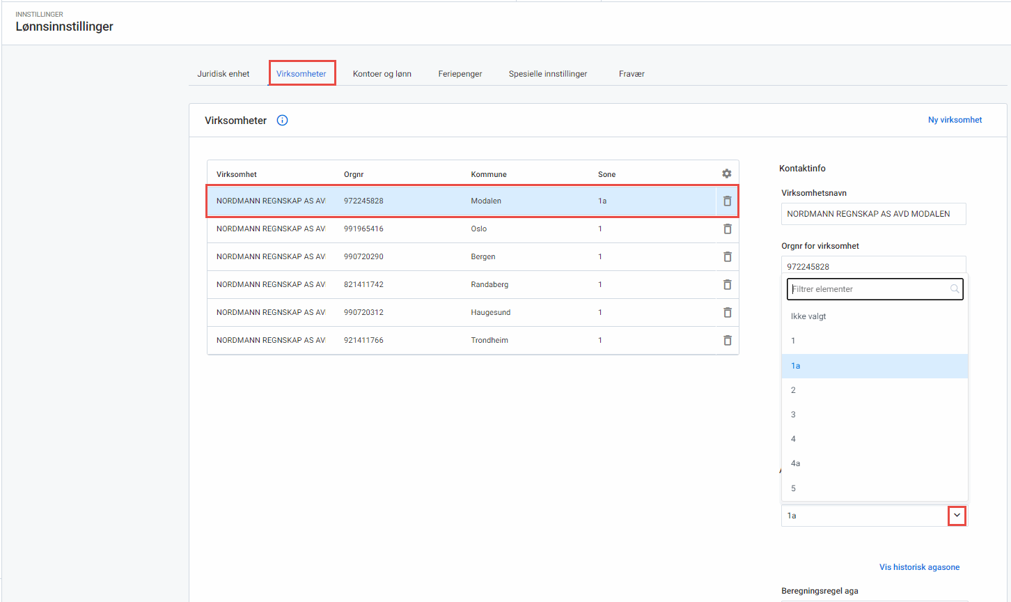 3. Klikk på en av virksomhetene og pilen for å velge ny aga-sone.