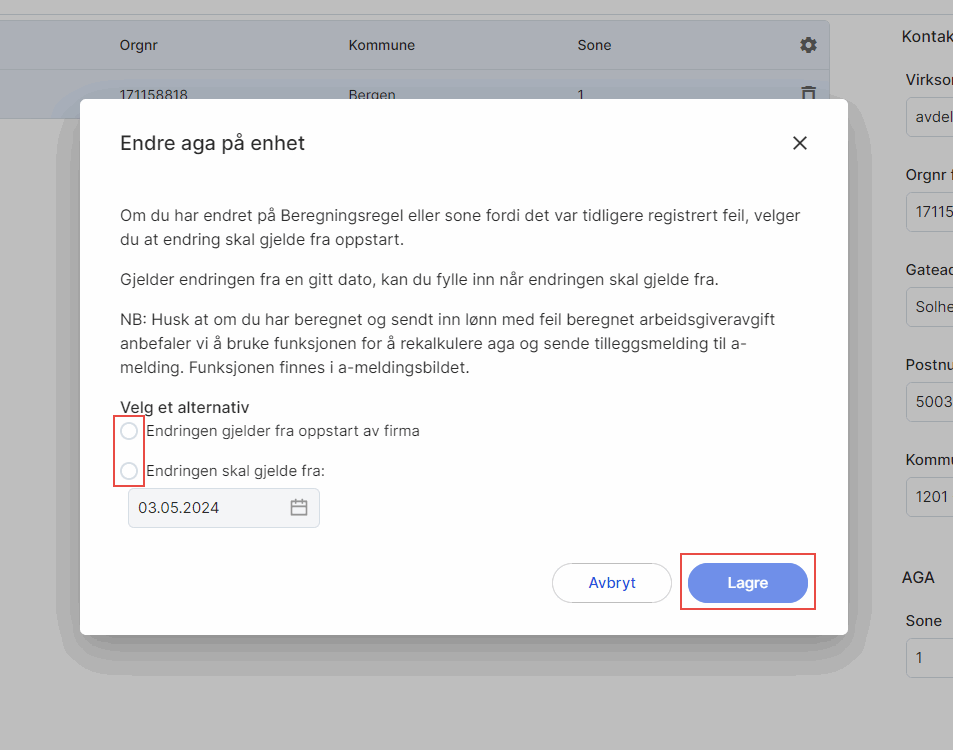 Endringen gjelder fra oppstart av firma: brukes ofte dersom du valgte feil aga-sone enten ved oppstart av selskapet eller ved oppstart i systemet.