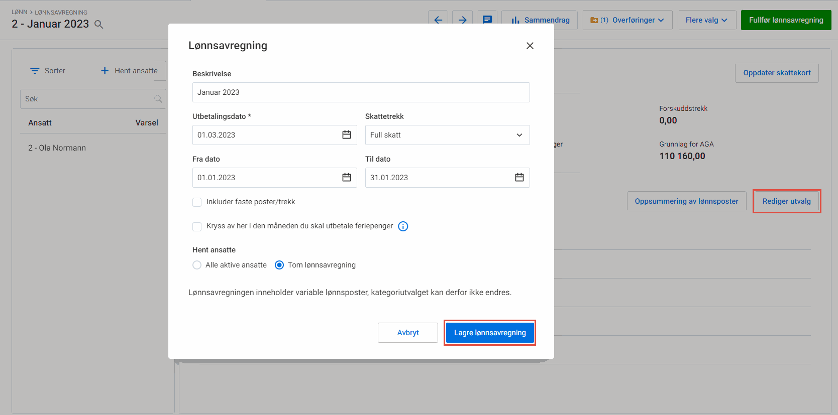 2. Klikk på Rediger utvalg. Gjennomfør ønskede endringer og klikk på Lagre lønnsavregning.