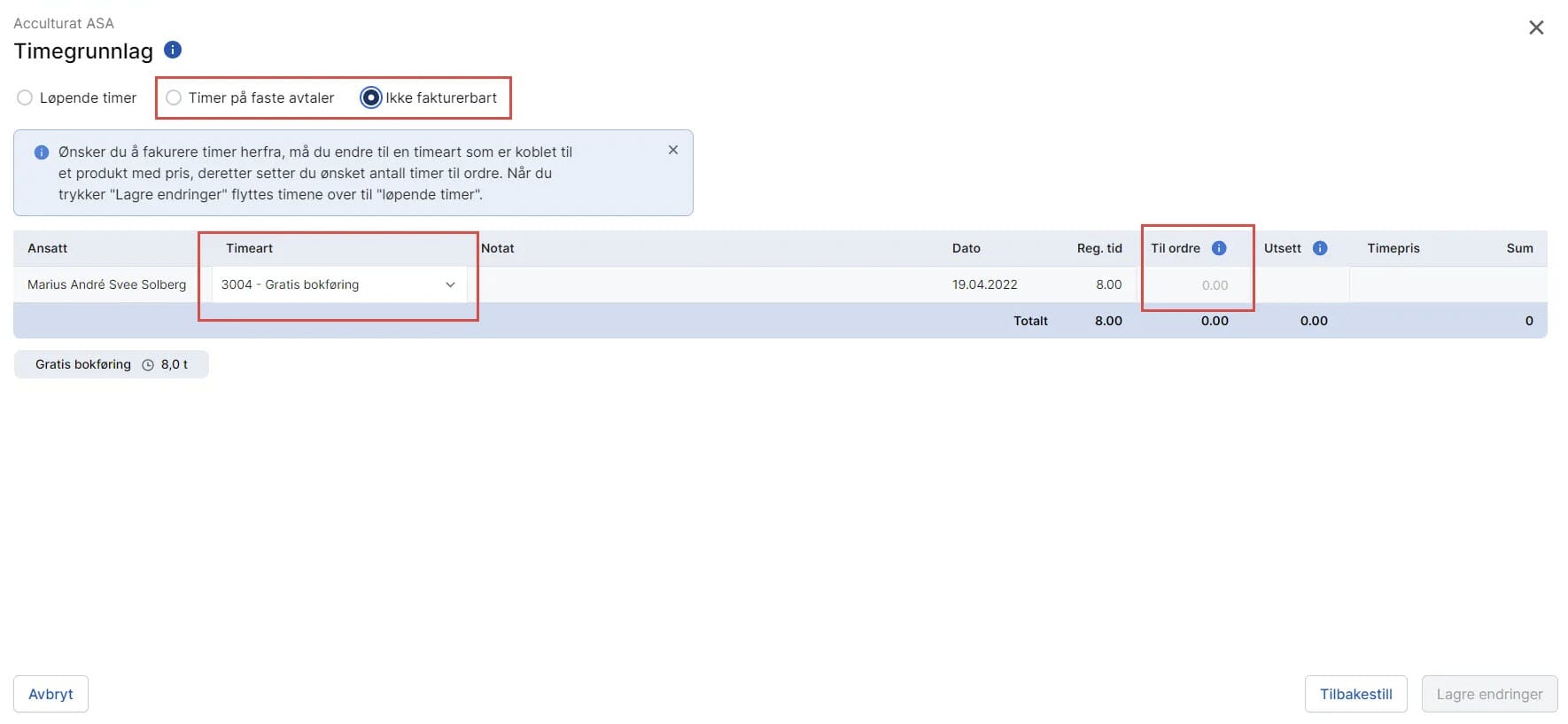 Merk at dersom du ønsker å fakturere timer fra fanen Ikke fakturerbar, må du endre til en timeart som er koblet til et produkt med pris, og deretter sette ønsket antall timer til ordre. Når du klikker på Lagre endringer flyttes timene over til løpende timer.
