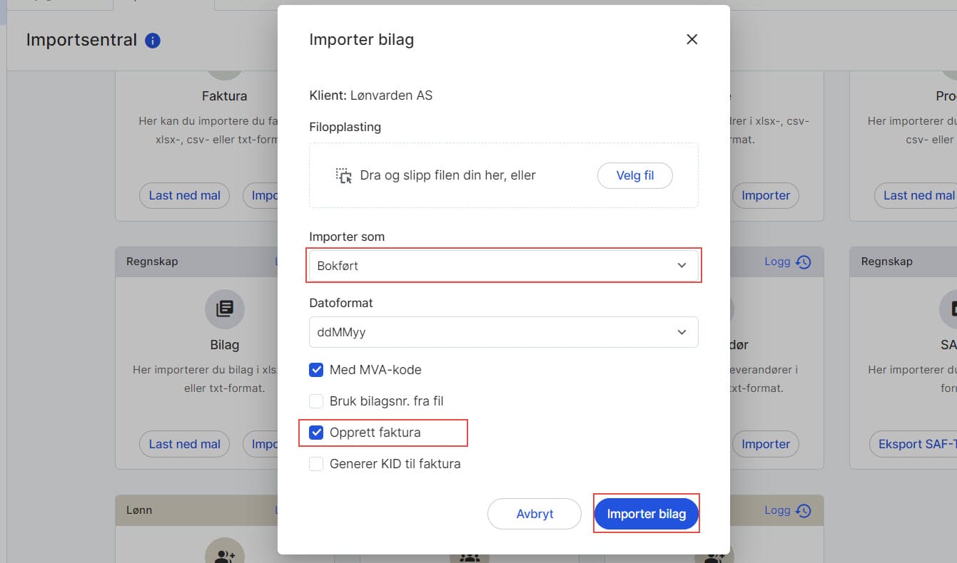 5. Velg Importer som bokført, og sett hake ved Opprett faktura. Hvis KID er angitt i filen du skal importere, vil denne informasjonen bli inkludert i faktura.