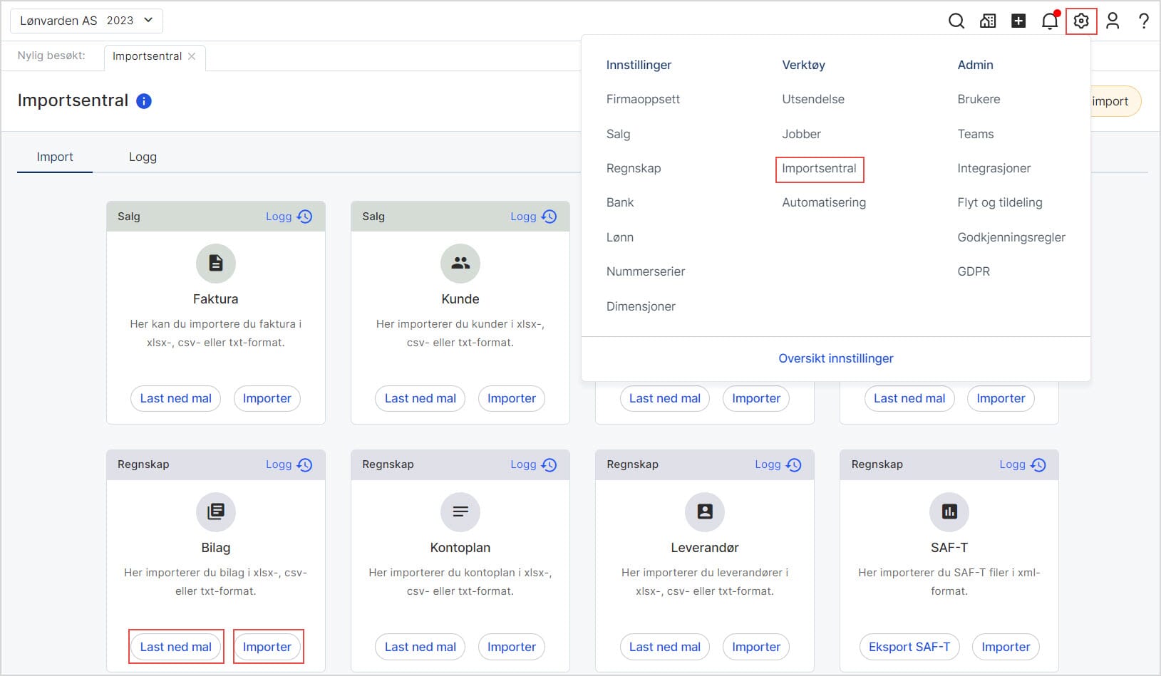 1. Gå til Innstillinger i toppmenyen og velg Importsentral.