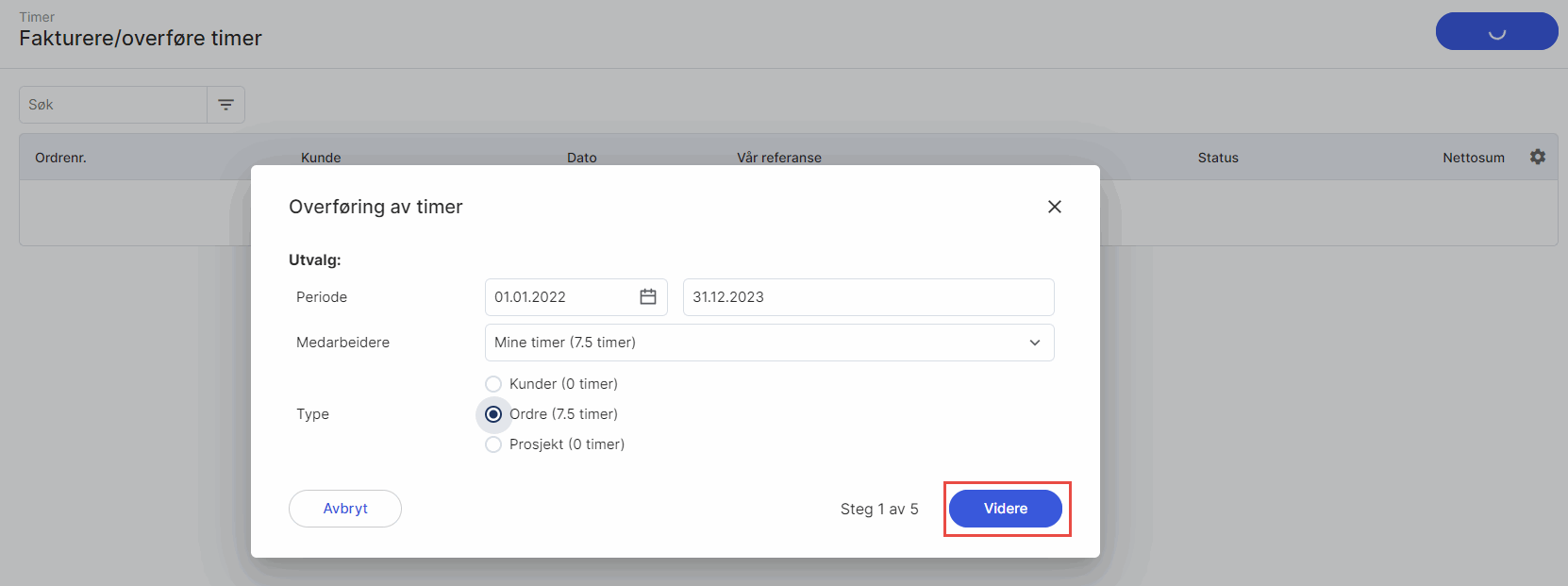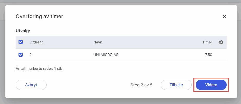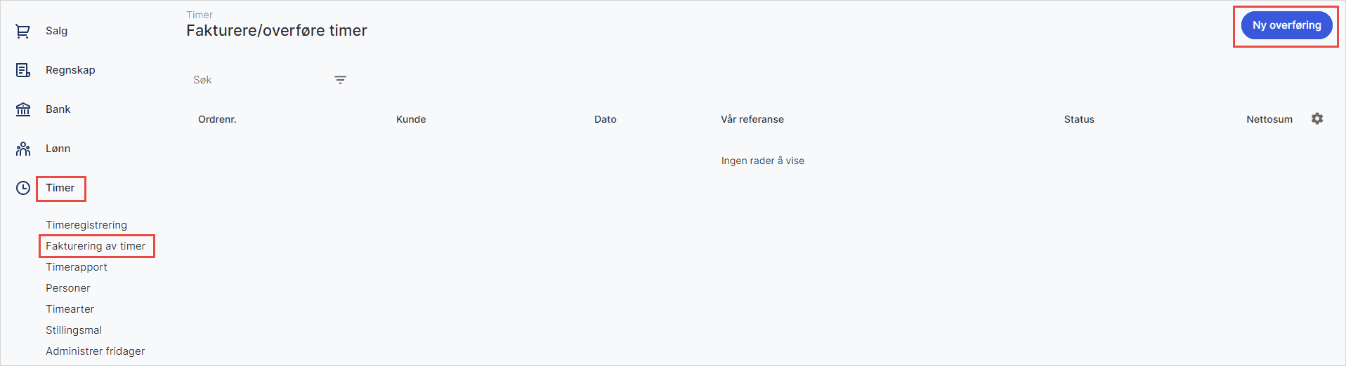 1. Gå til Timer i venstremenyen og velg Fakturering av timer. Klikk på Ny overføring for å starte en ny veiviser hvor du velger hvilke timer som skal overføres. Timene vil overføres når du har fullført veiviseren.