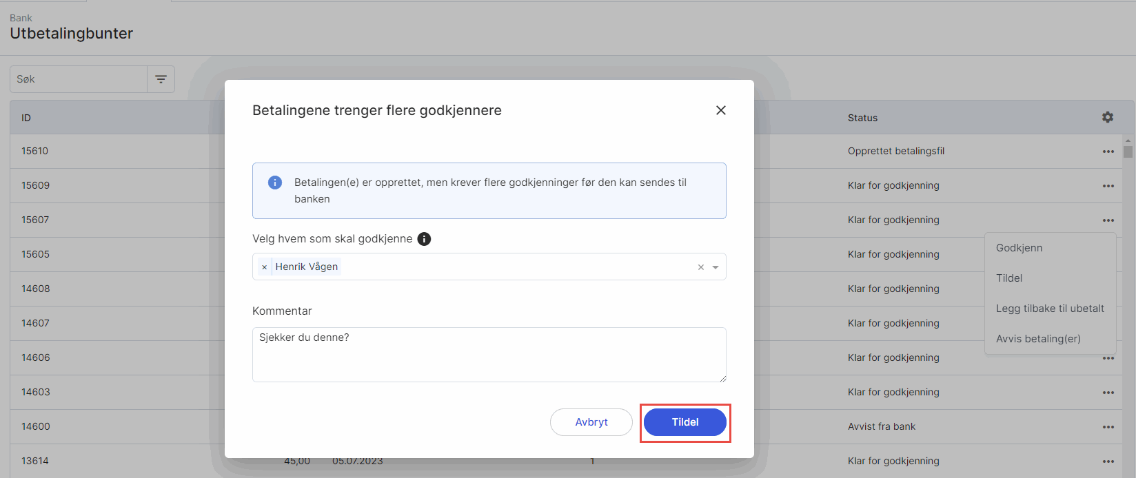 2. Klikk på Godkjenn. Du får muligheten til å legge til en kommentar før du fullfører godkjenningen. Når betalingsbunten er godkjent av alle brukere, vil den bli sendt videre til banken.