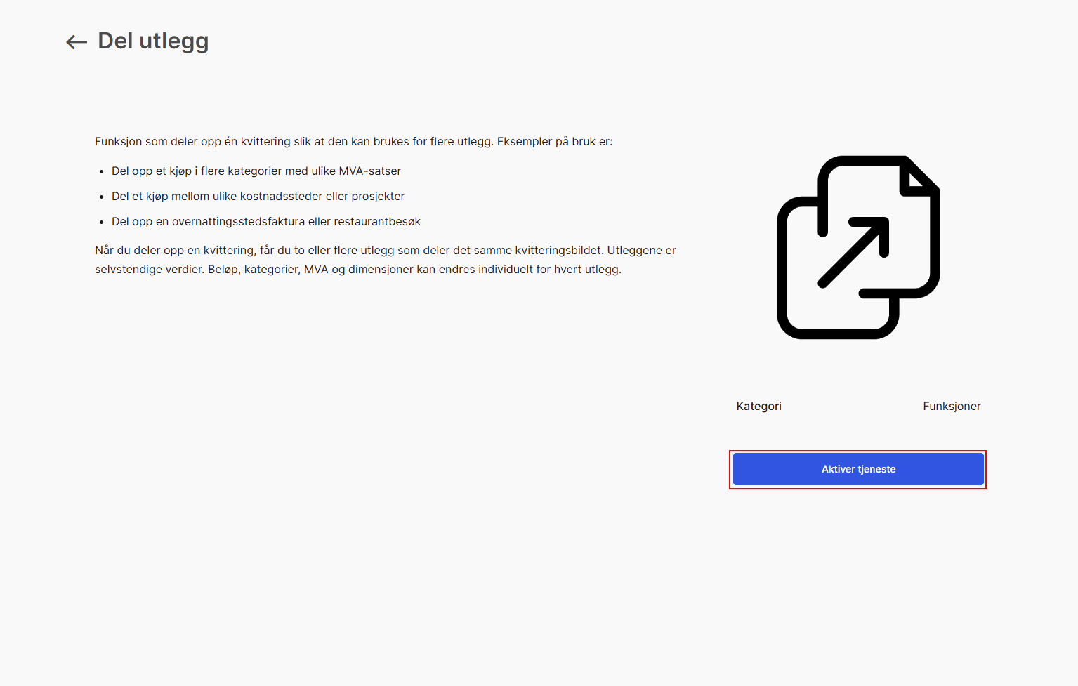 Aktivere "Del opp kvittering" Sist oppdatert 31.03.2026 Denne artikkelen gjelder administrator i Unimicro Reise og Utlegg. Denne funksjonen lar deg dele opp en kvittering slik at den kan brukes til flere utlegg. 1. Gå til Markedsplass i venstremenyen. 2. Klikk på Del utlegg. 3. Klikk på Aktiver tjeneste.