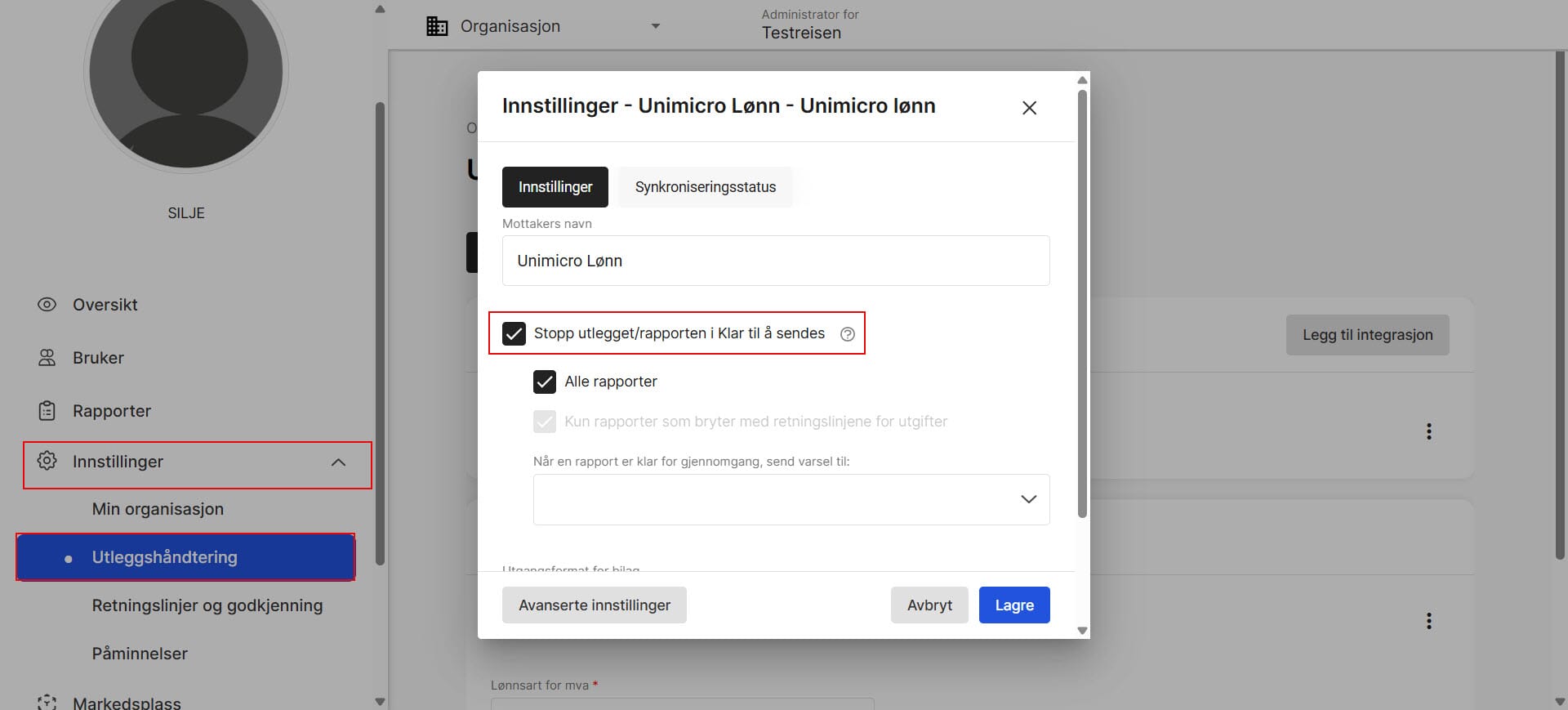 I eksempelet her har vi trykt på integrasjonen Unimicro Lønn. Klikk på integrasjonene og sett hake ved Stopp utlegget/rapporten i Klar til å sendes, husk å lagre.