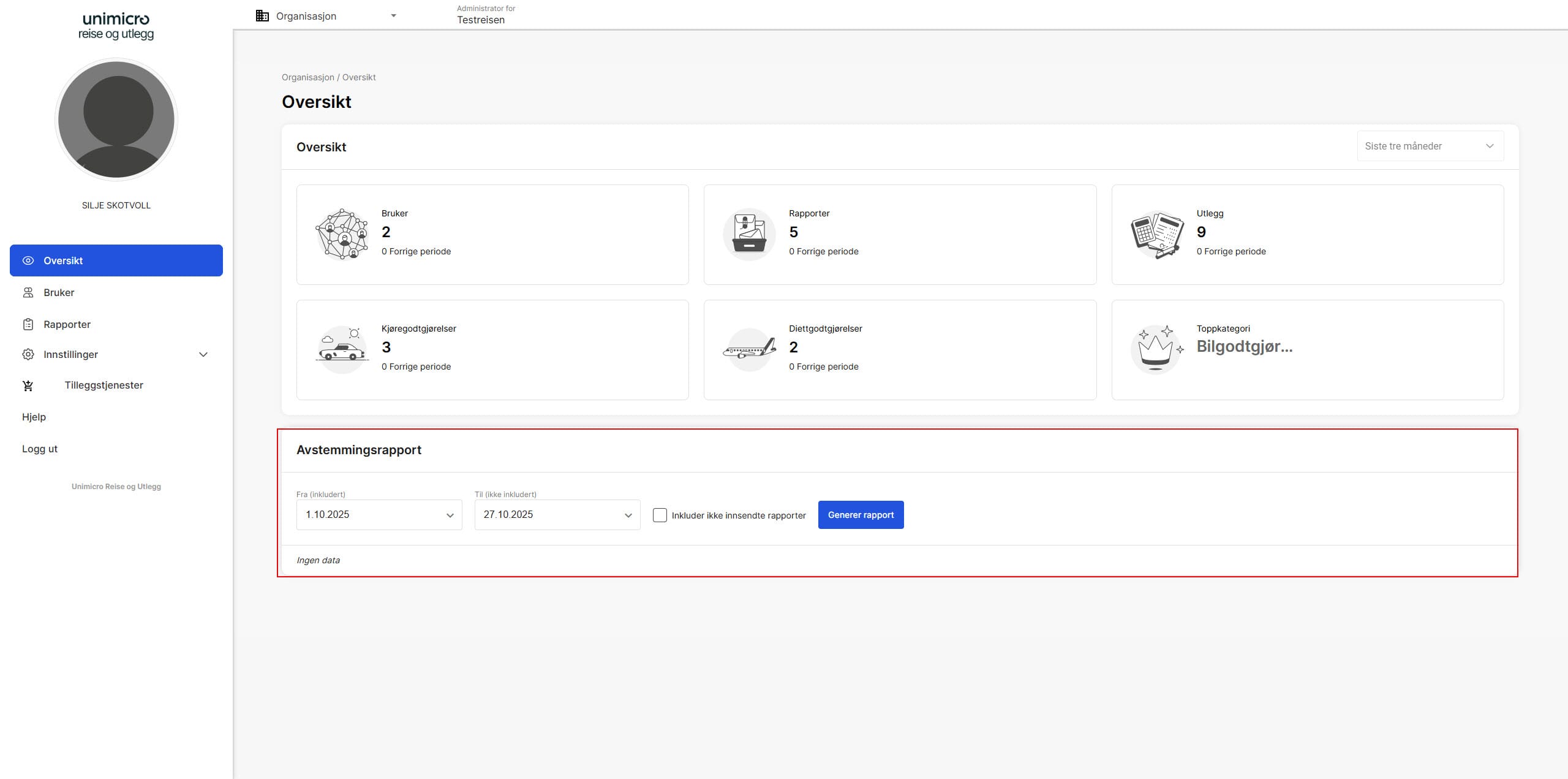 Klikk på Oversikt i venstremenyen og bla ned til Avstemmingsrapport.