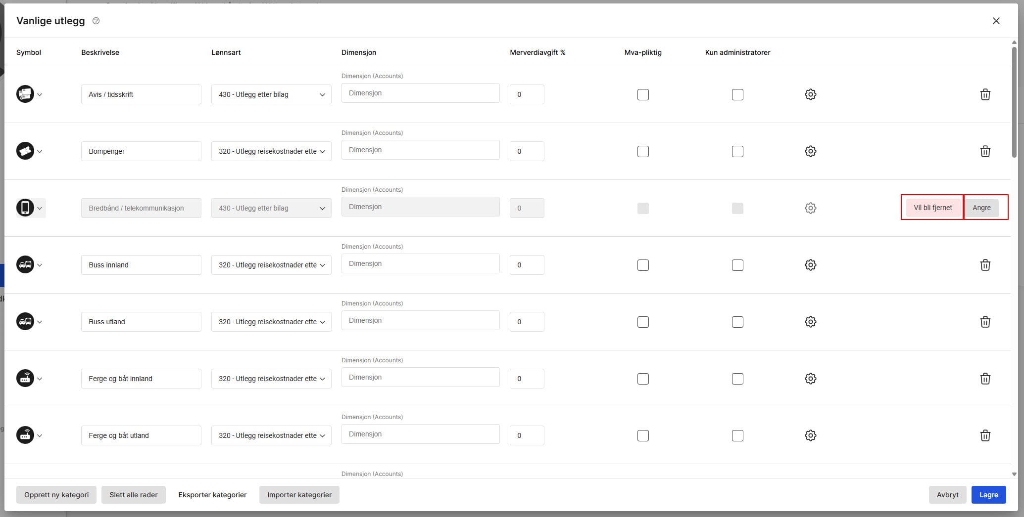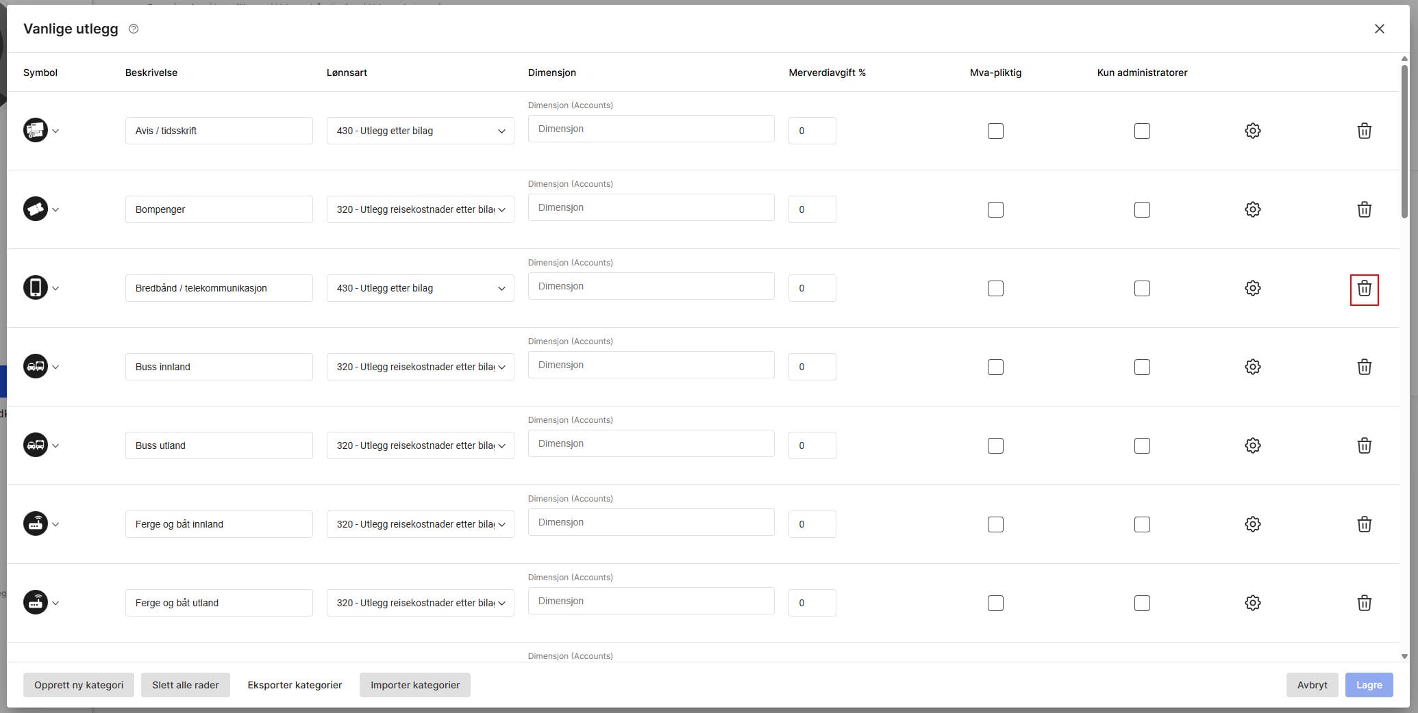Klikk på slett for å fjerne den spesifikke utleggskategorien.