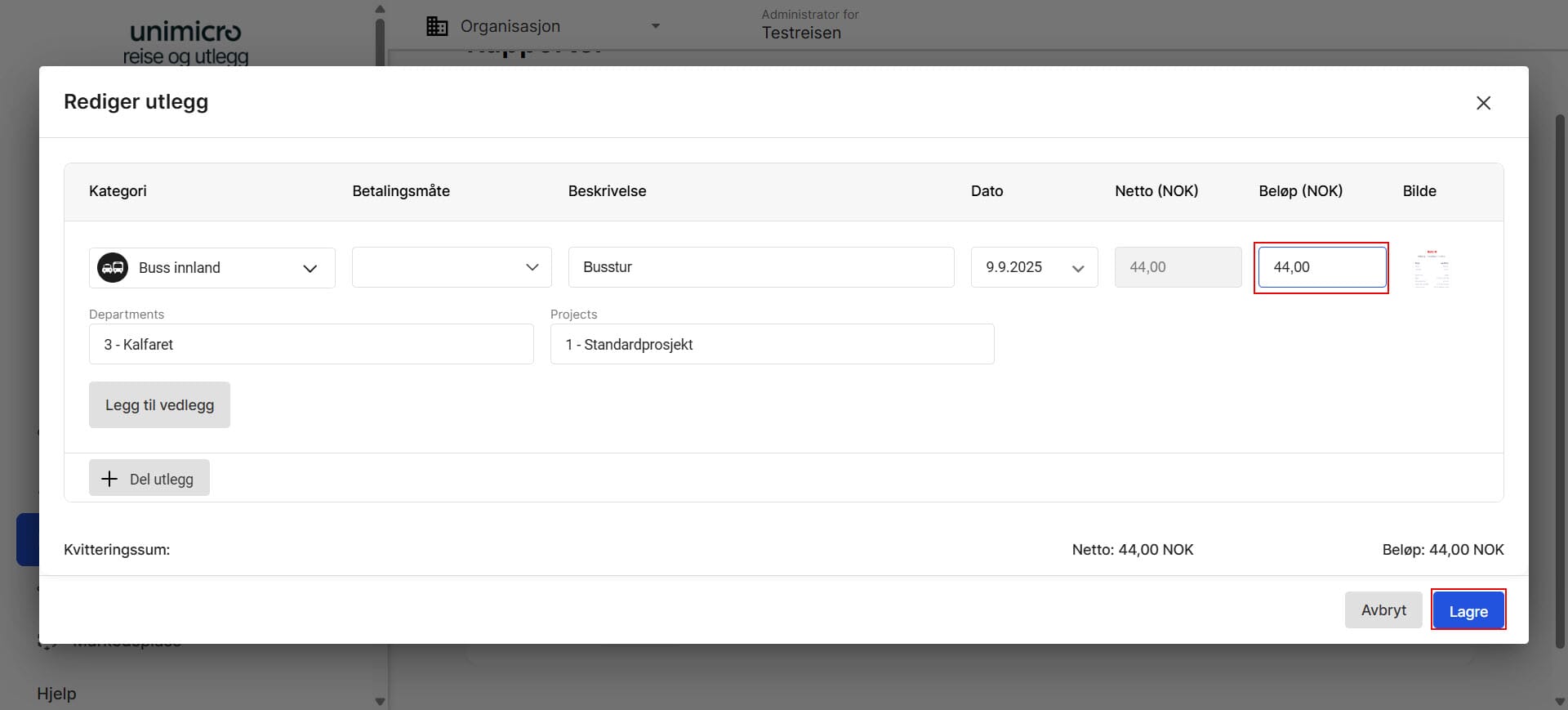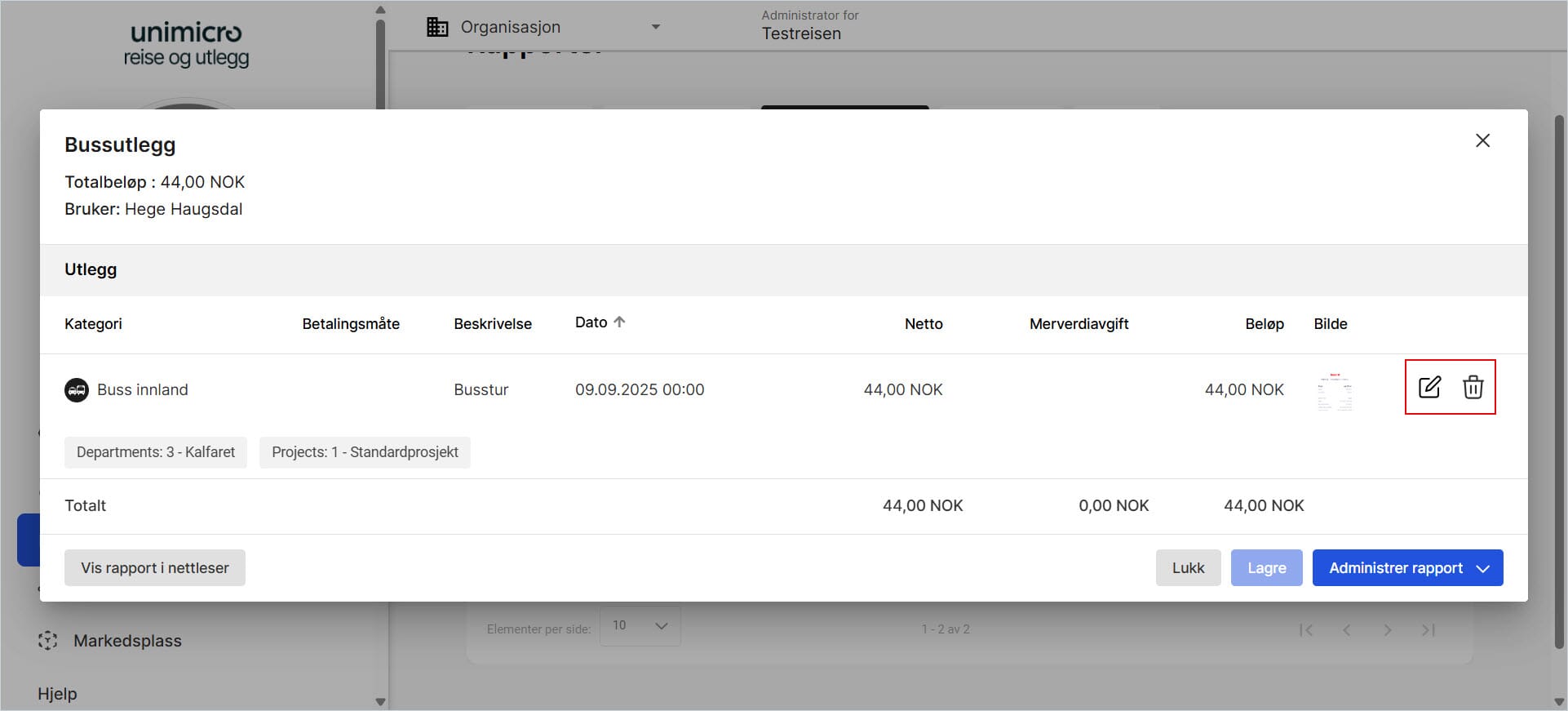 Trykk på rediger på utlegget som du skal gjøre endringer på. Du kan også fjerne utlegg fra rapporten i denne oversikten.