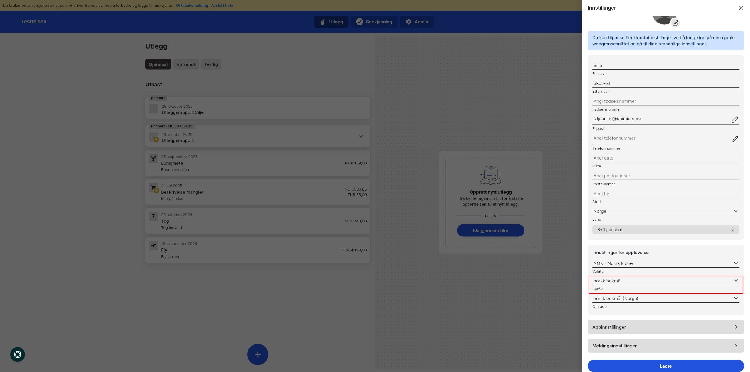 Hvordan endre språk? Sist oppdatert 05.02.2026 Denne artikkelen gjelder bruker i Unimicro Reise og Utlegg. For å endre språk klikker du på de tre strekene oppe til høyre. Klikk på Innstillinger. Bla ned til feltet språk, og velg ønsket språk.