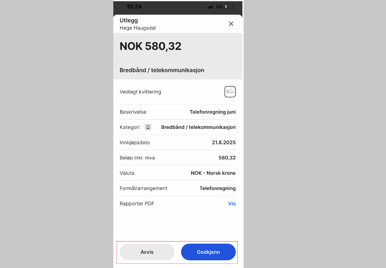 Når du mottar en rapport til godkjenning, får du en e-post og et varsel med informasjon om rapporten. Du kan godkjenne eller avslå hele rapporten, eller bare enkelte utlegg.