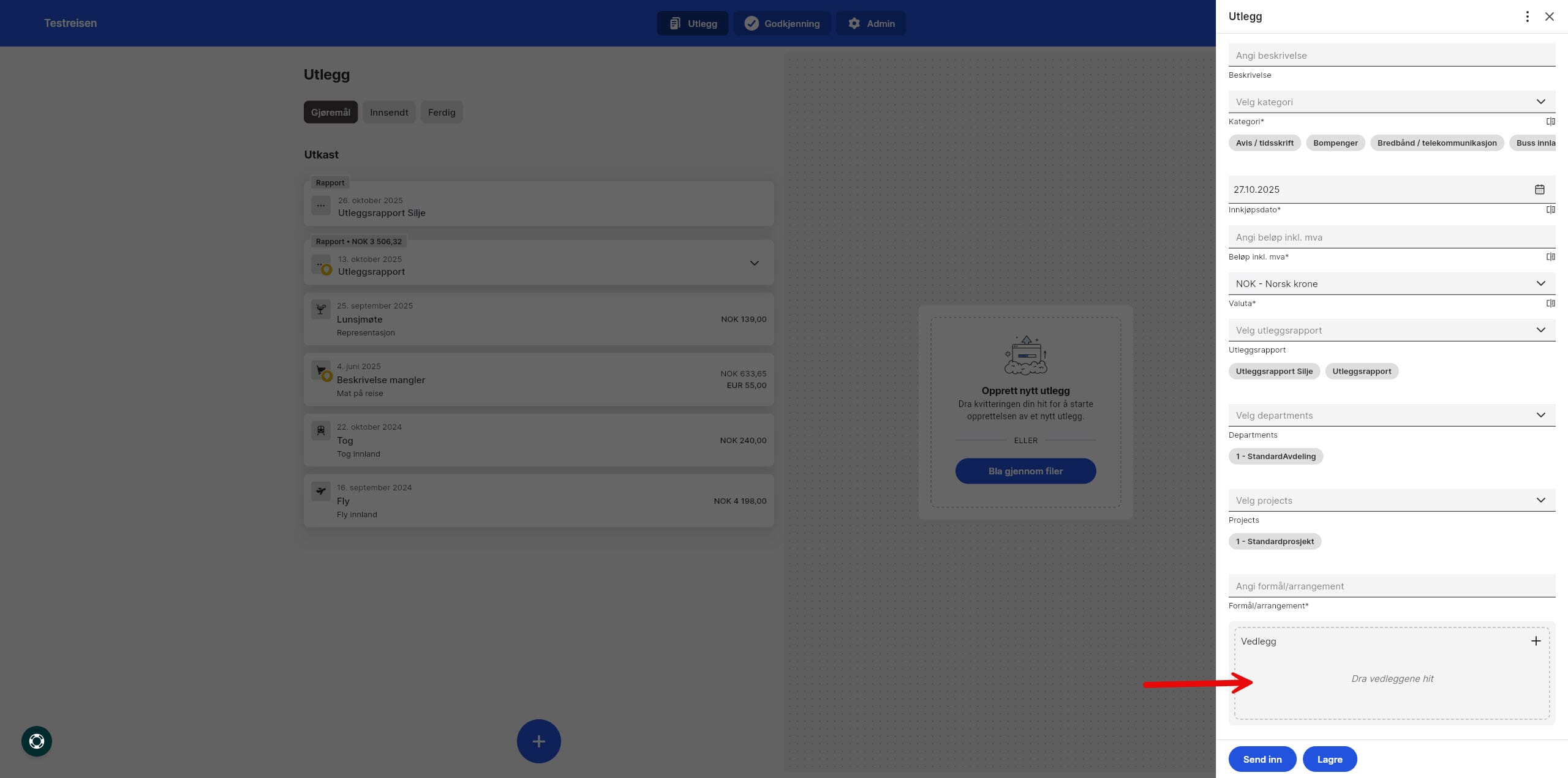 Hvordan legge til vedlegg i et utlegg Sist oppdatert 27.10.2025 Denne artikkelen gjelder bruker av Unimicro Reise og Utlegg. I utlegget ditt kan du legge til et vedlegg knyttet til utlegget.Dette er kun mulig for utlegg, og ikke for kjøregodtgjørelse eller diettgodtgjørelse. Bla ned til "Vedlegg" i utlegget, og legg til vedlegget du skal ha med, og klikk Lagre.