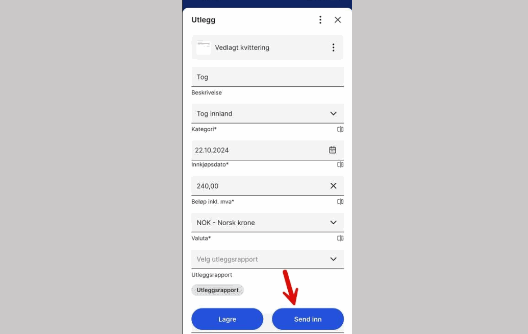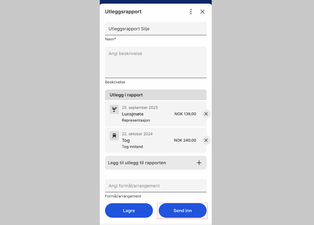 5. Når du har lagt til ønskede utlegg i rapporten, klikker du på Send inn.