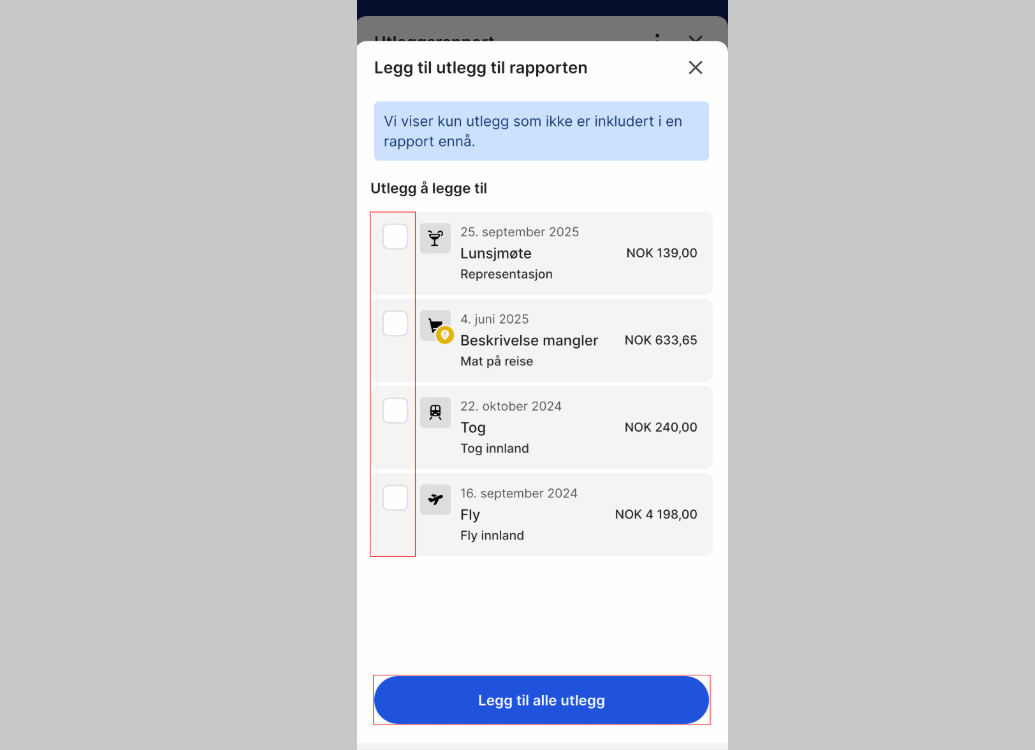 4. Velg hvilke utlegg du vil inkludere i rapporten. Du kan legge til enkelte vedlegg, eller klikke på Legg til alle utlegg.