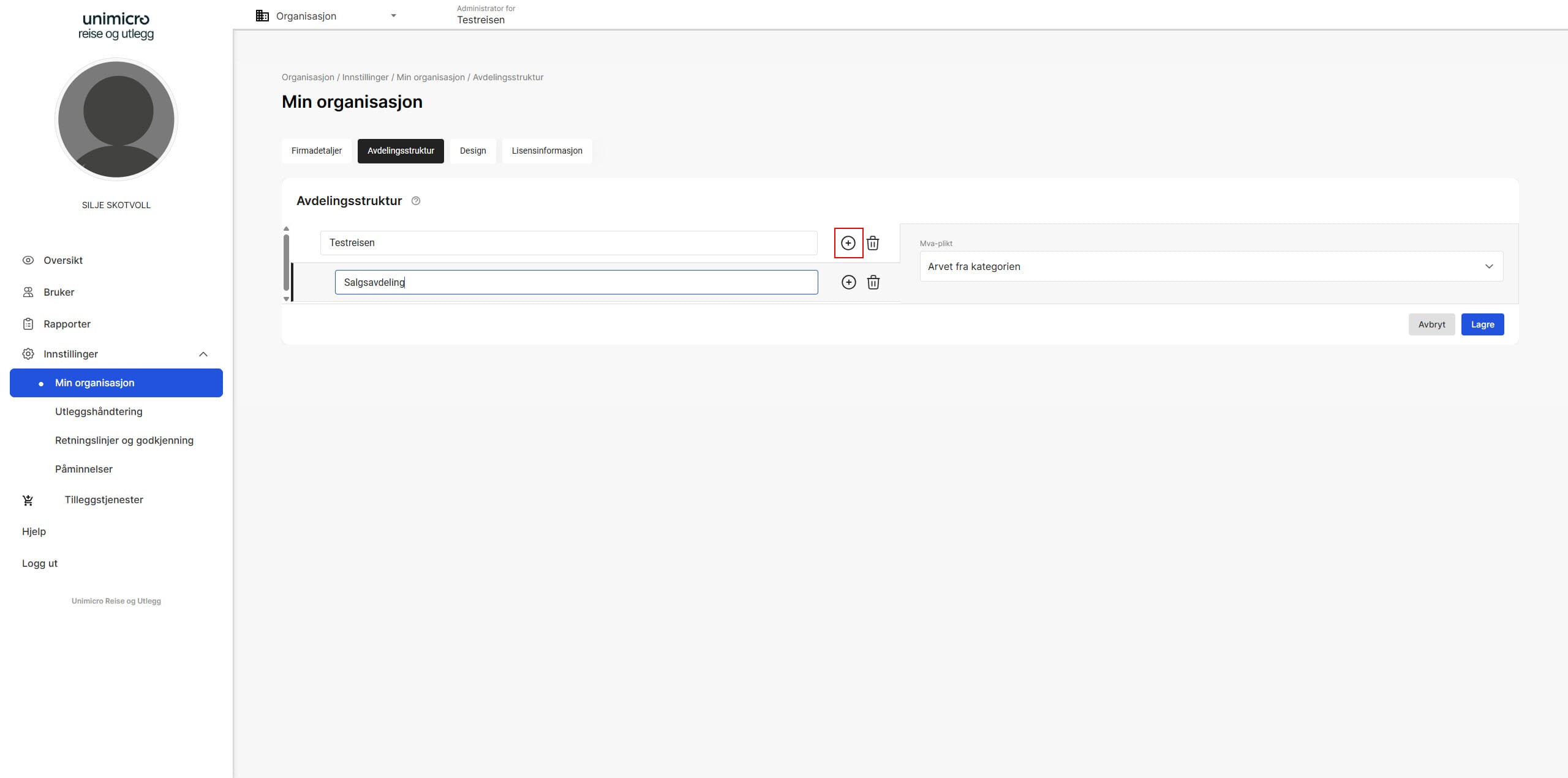 Det er også mulig å legge til underavdelinger ved å klikke på + ikonet på avdelingen.