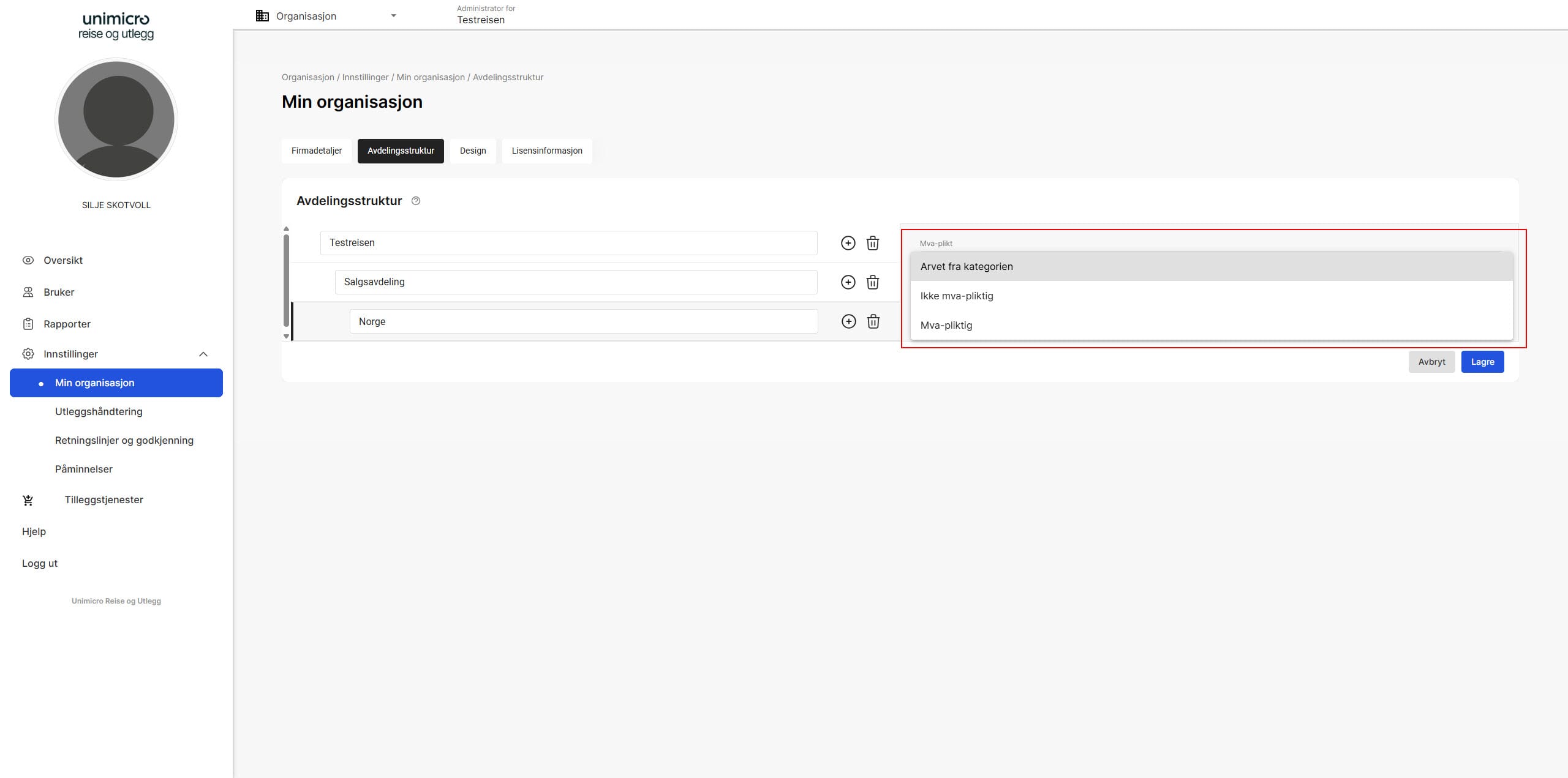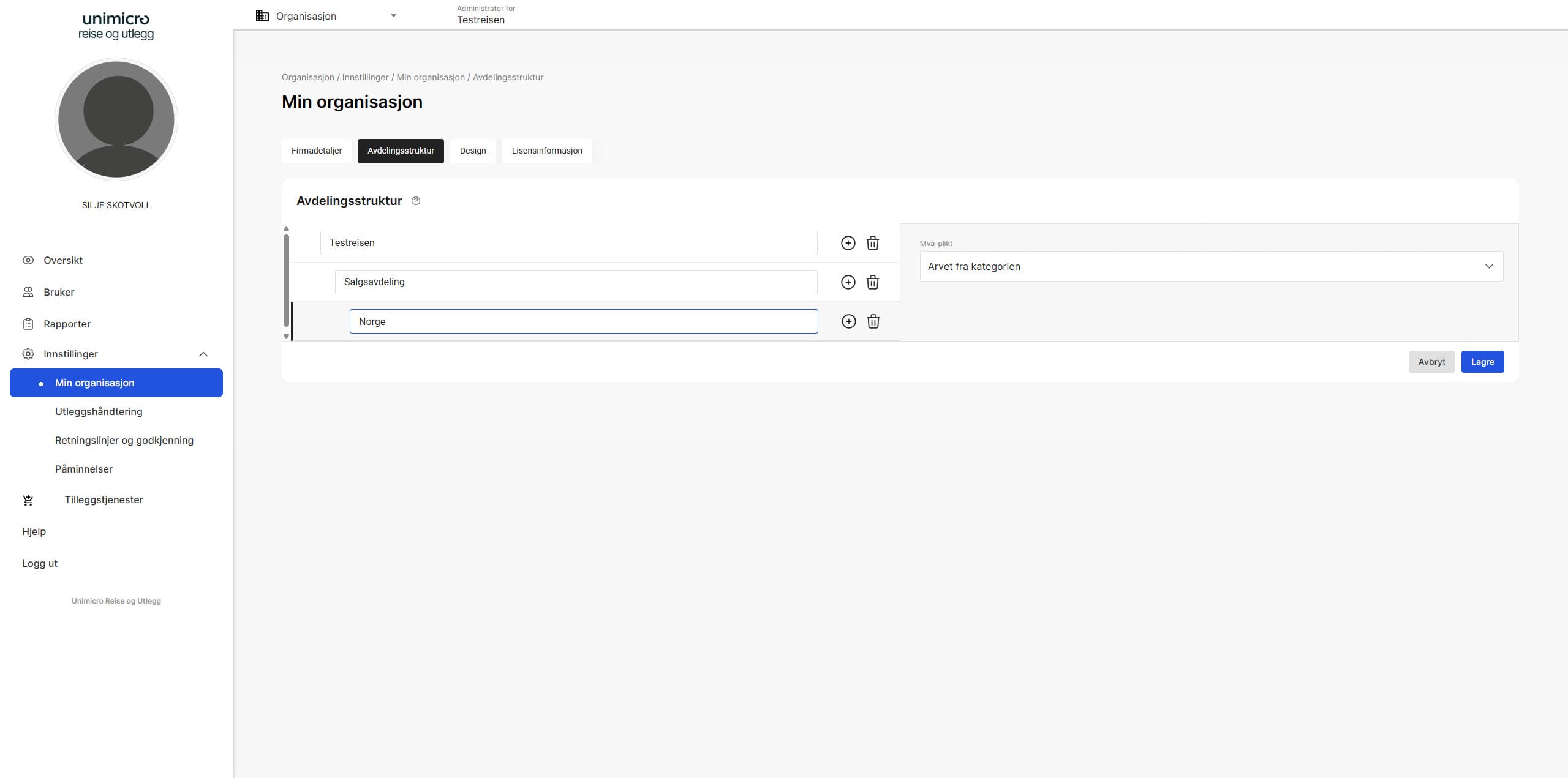 Klikk på Innstillinger - Min organisasjon - Avdelingsstruktur