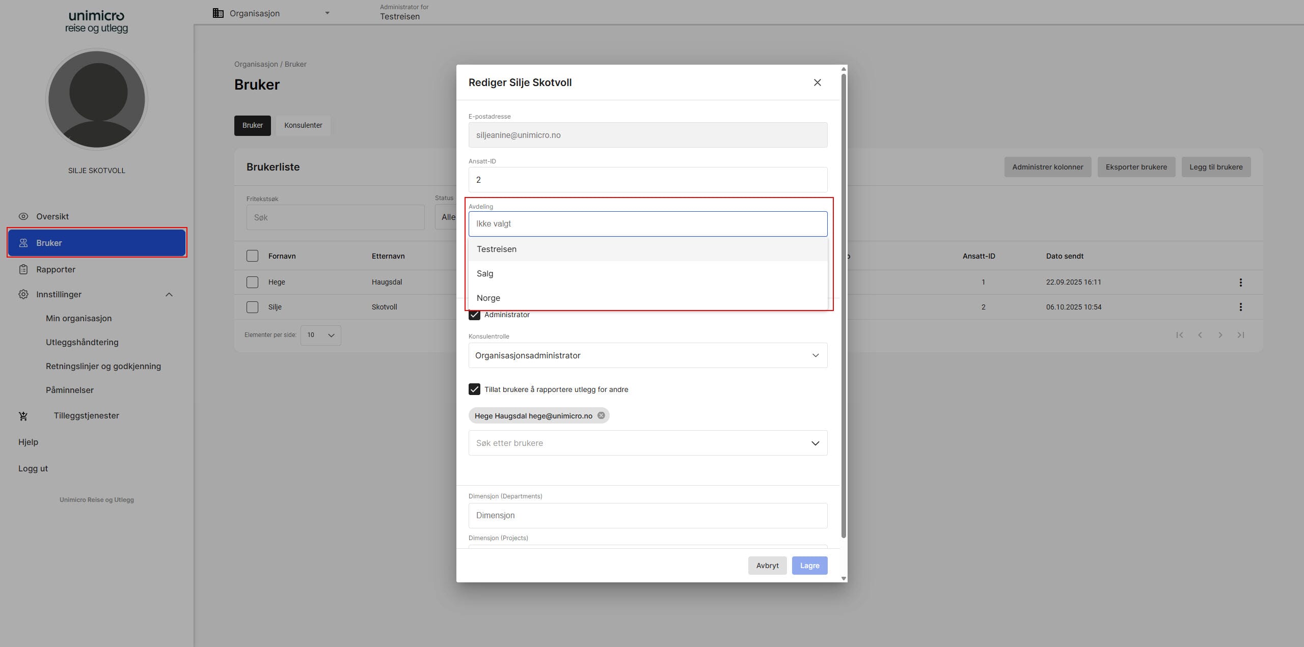 Neste steg er å knytte bruker til avdeling. Klikk på Bruker i venstremenyen, og klikk på den brukeren du skal knytte til en avdeling. Klikk på Avdeling og velg den som bruker skal knyttes til.
