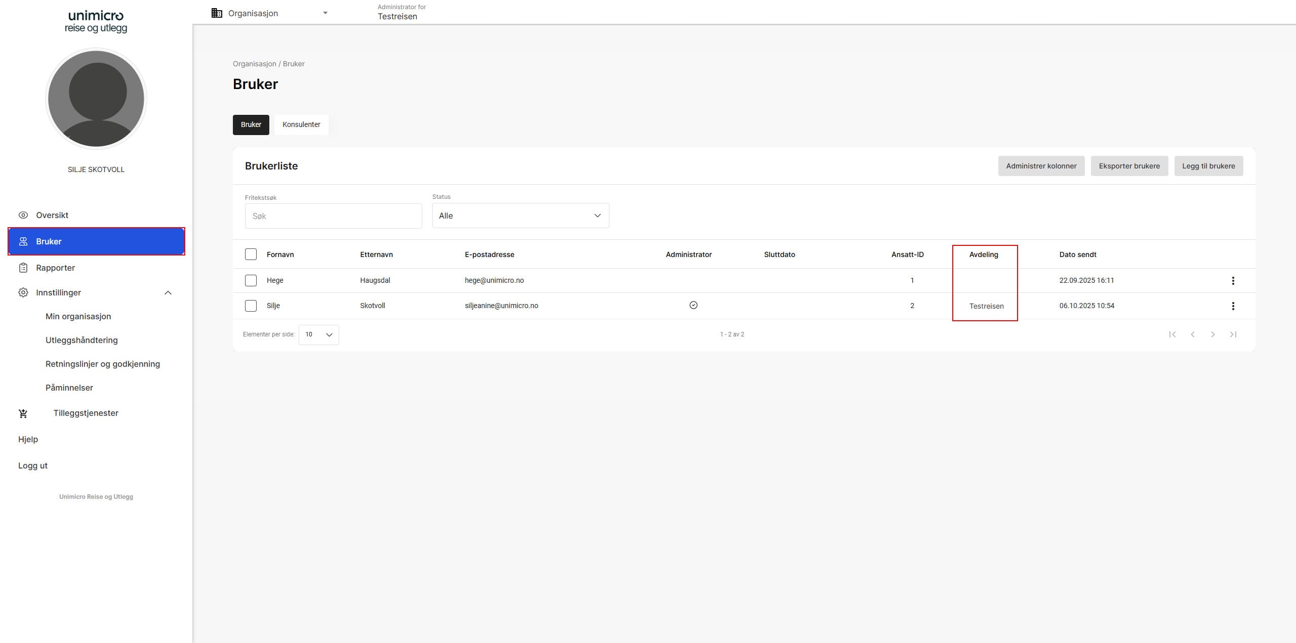 I brukerlisten vil du se hvilken avdeling hver bruker tilhører.