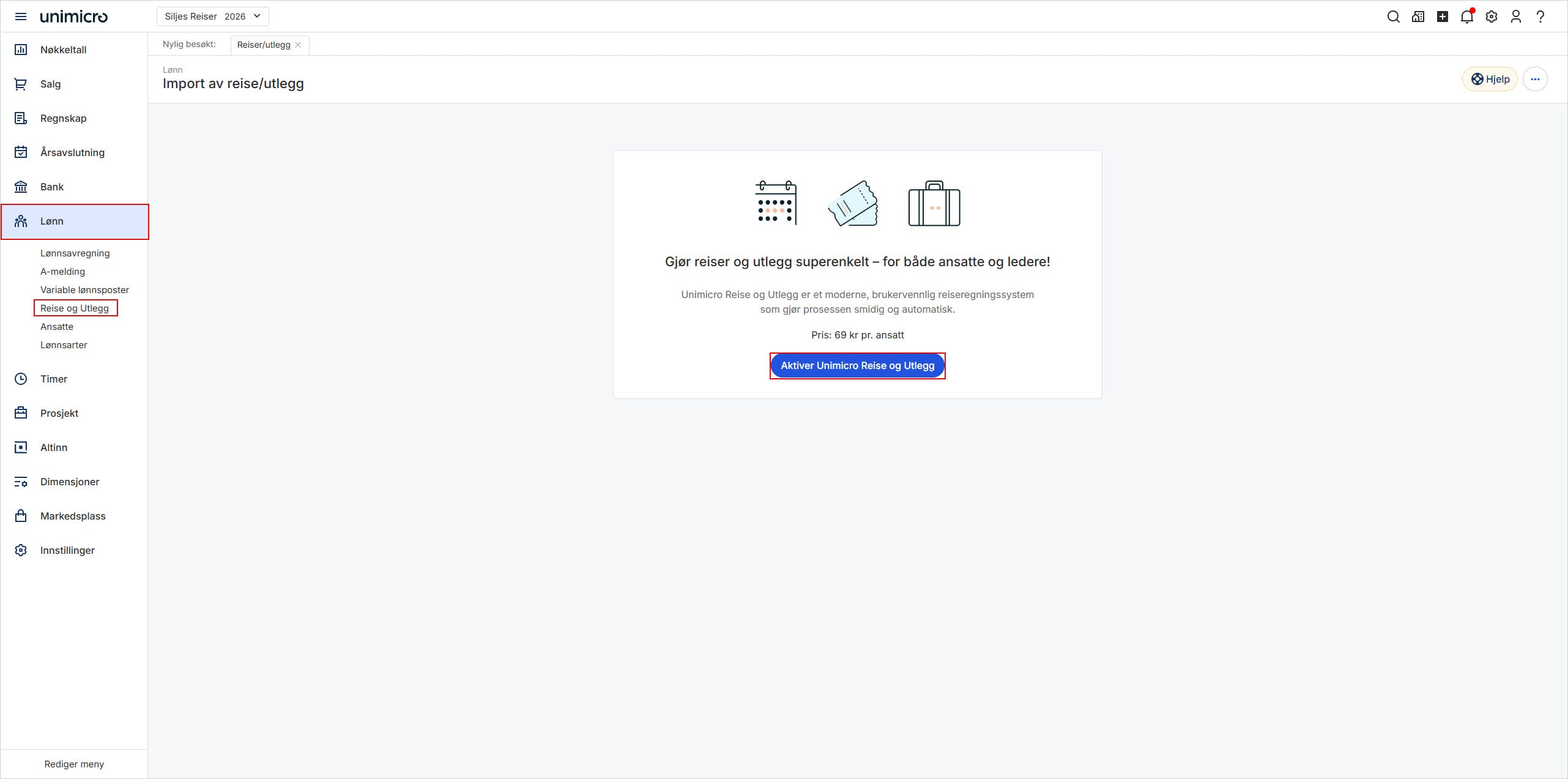 Alternativ 2: Gå til Lønn i venstremenyen, klikk på Reise og Utlegg og klikk deretter på Aktiver Unimicro Reise og Utlegg