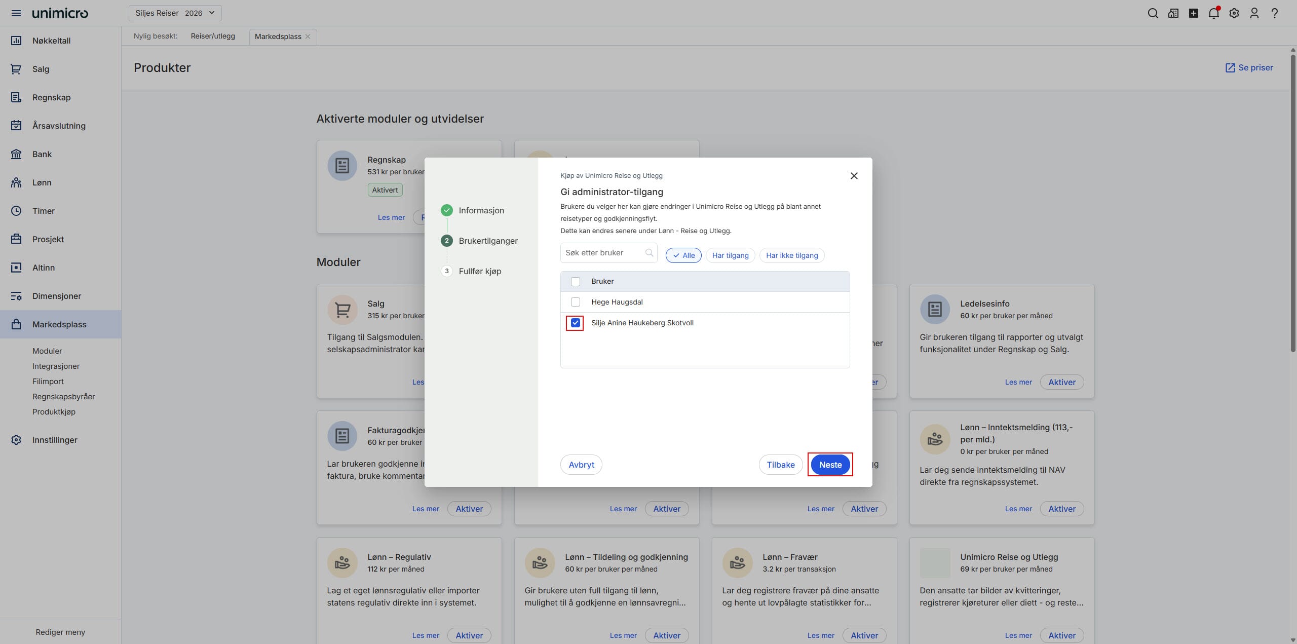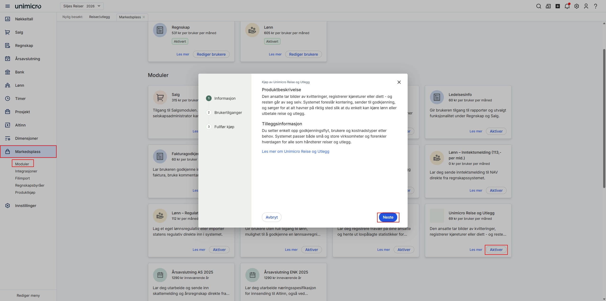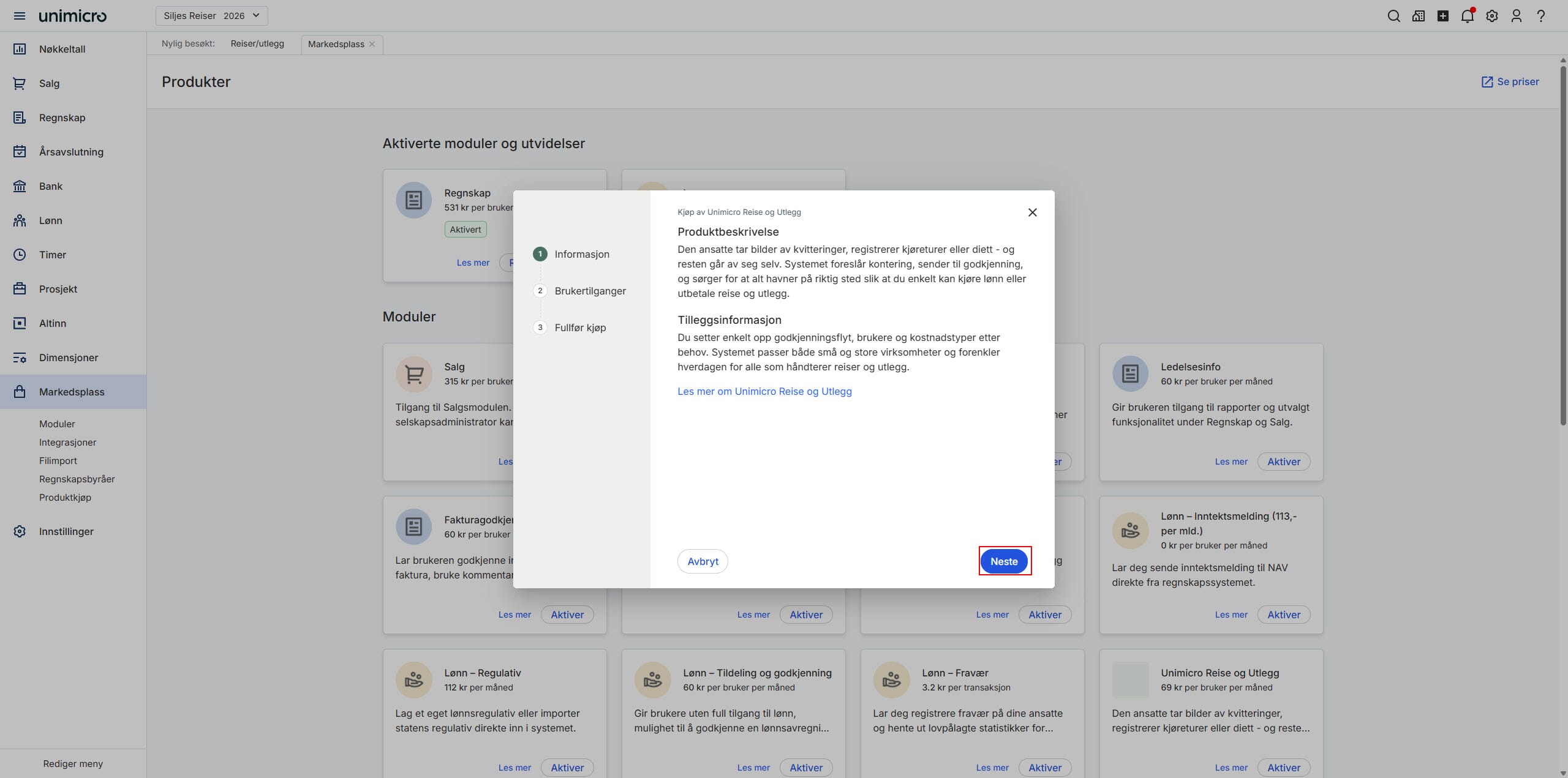 Alternativ 1: Gå til Markedsplass, klikk på Unimicro Reise og Utlegg og klikk deretter på Neste