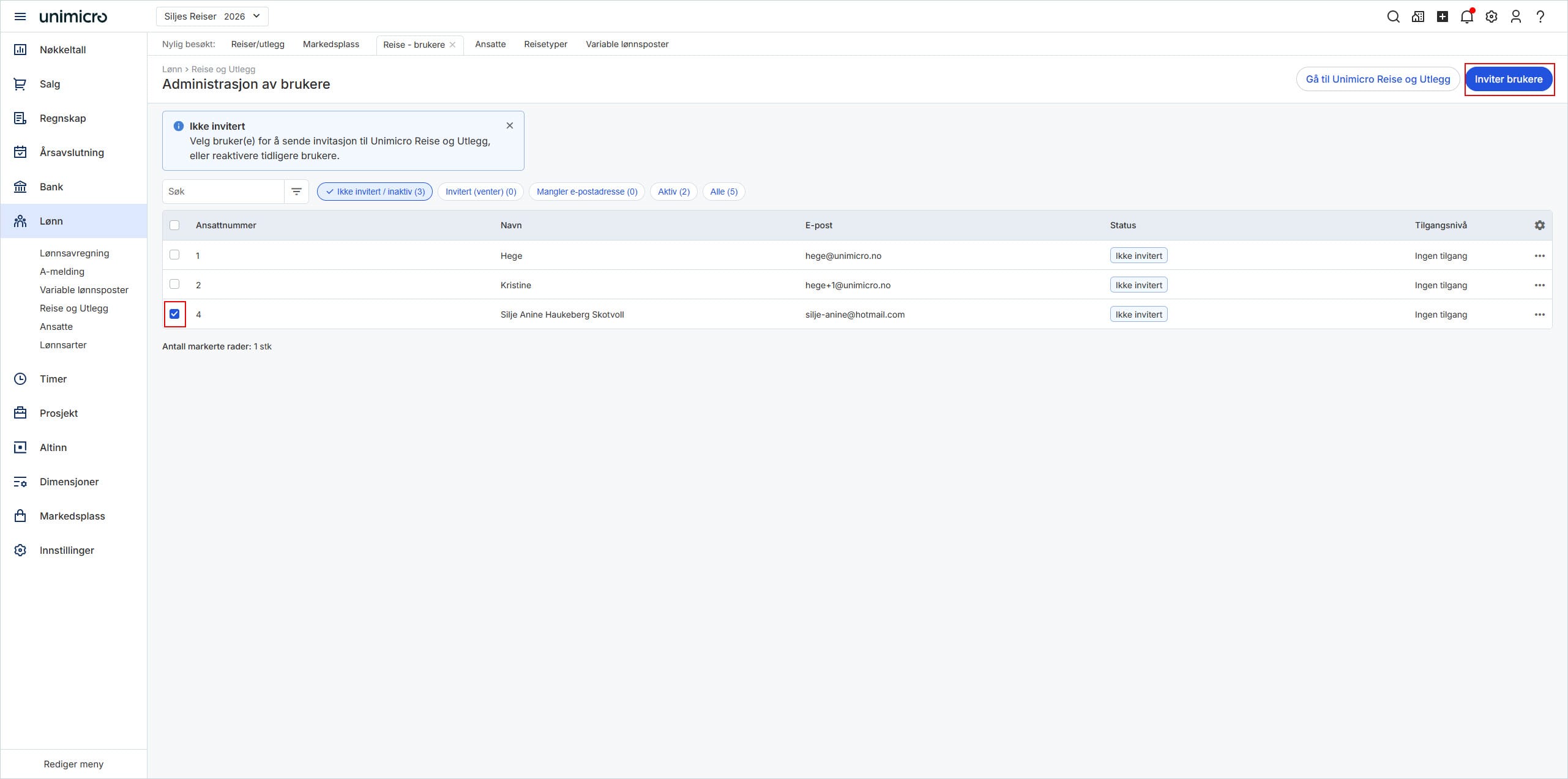 Ved å klikke på Gå til administrasjon av brukere, vil du kunne administrere og invitere brukere til Unimicro Reise og Utlegg. Sett hake ved ansatte som skal inviteres og klikk på Inviter bruker.