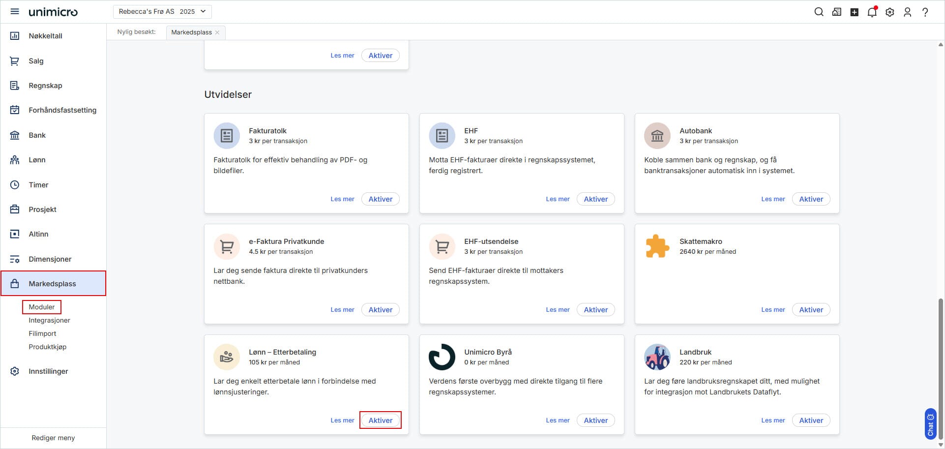 2. Velg Lønn - Etterbetaling og klikk på Aktiver.