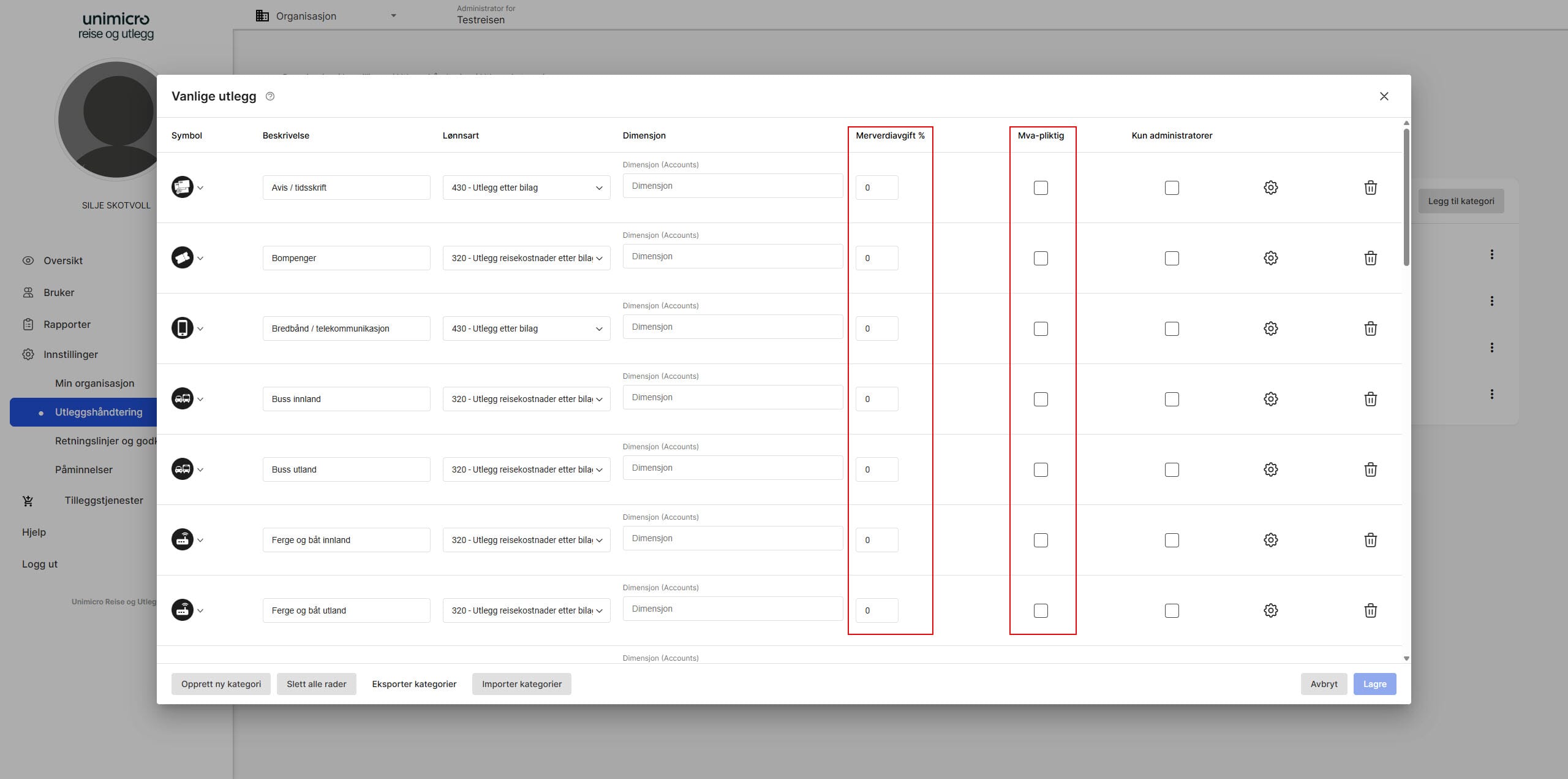 Mva-fritak på utlegg Sist oppdatert 02.11.2025 Denne artikkelen gjelder administrator i Unimicro Reise og Utlegg Klikk på Innstillinger - Utleggshåndtering - Utleggskategorier - Utlegg. Fjern hake ved Mva-pliktig og skriv inn 0 i feltet for Merverdiavgift %. Klikk Lagre.