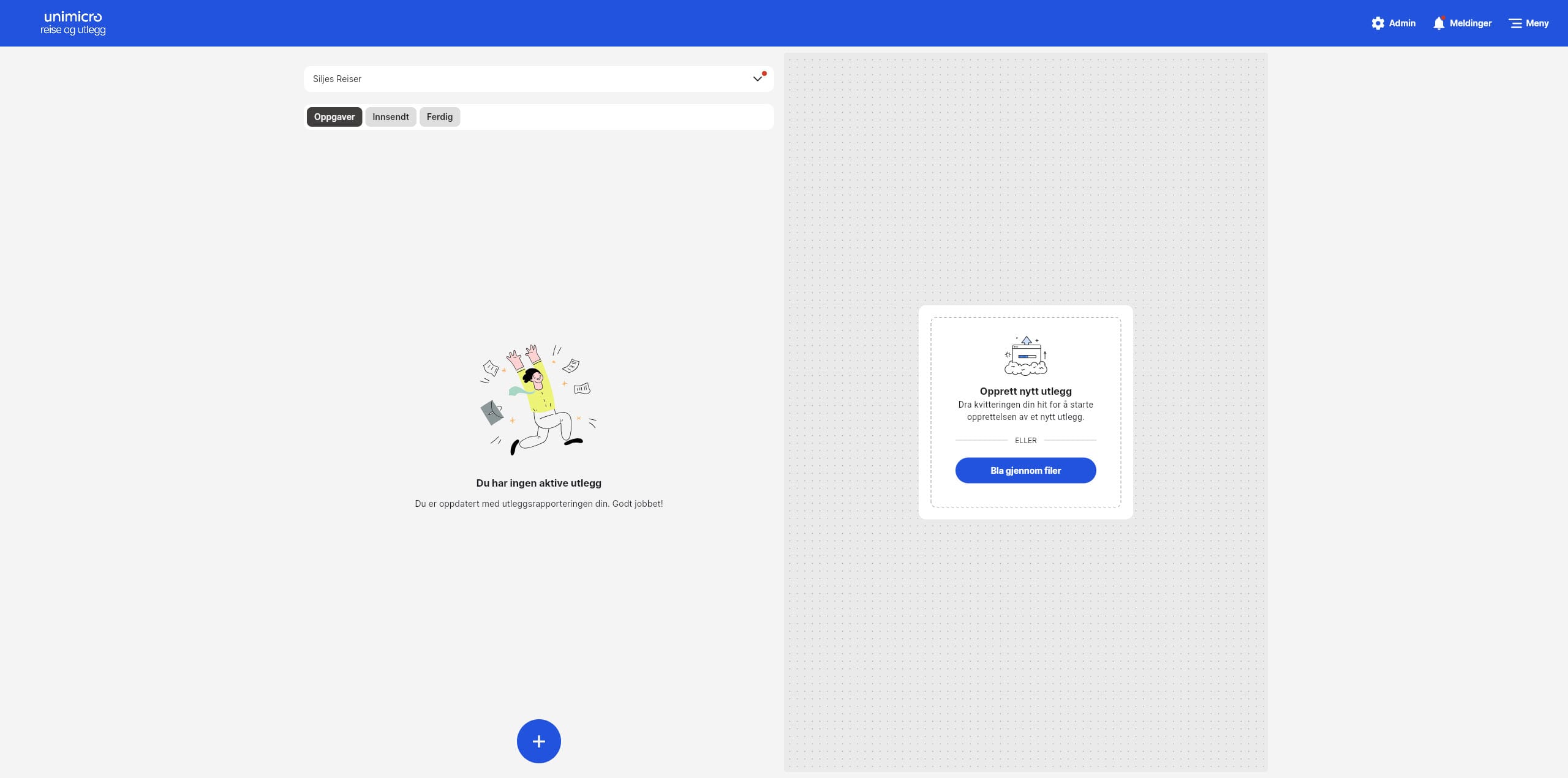 Nå er alt av informasjon på plass, og du er klar til å bruke systemet og er inne i Unimicro Reise og Utlegg