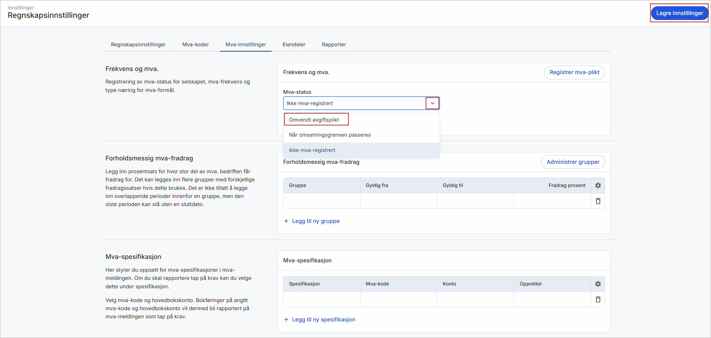 1. Gå til innstillinger i toppmenyen, velg Regnskap og fanen Mva-innstillinger