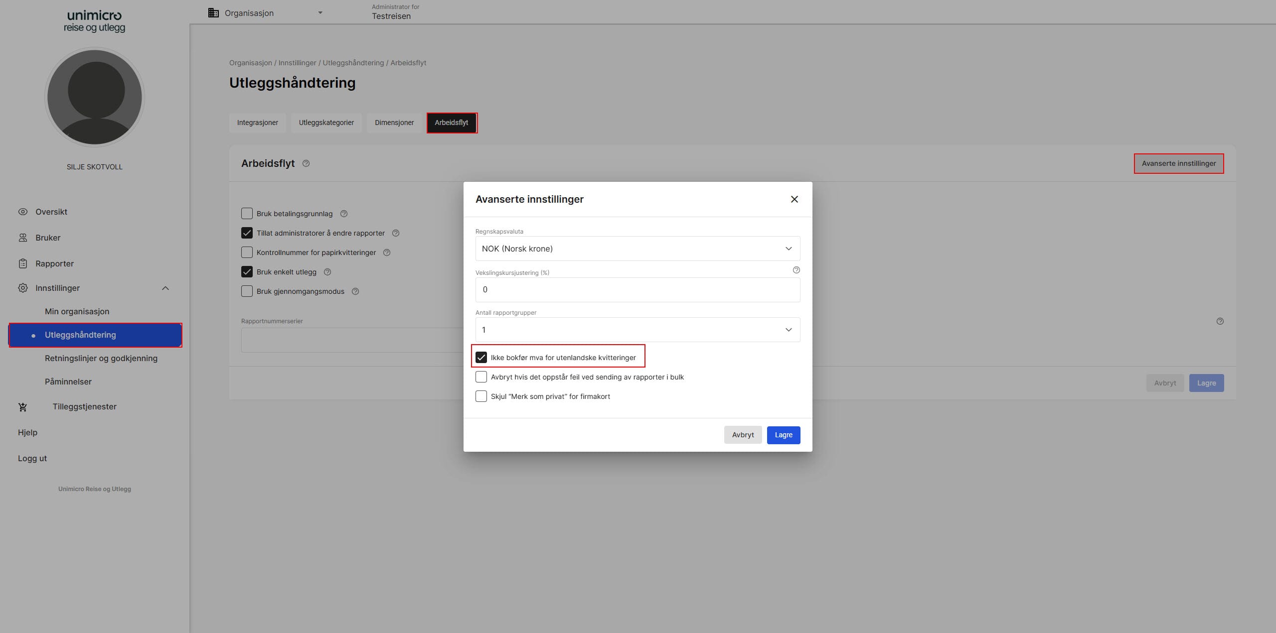Klikk på Innstillinger - Utleggshåndtering - Arbeidsflyt - Avanserte innstillinger.