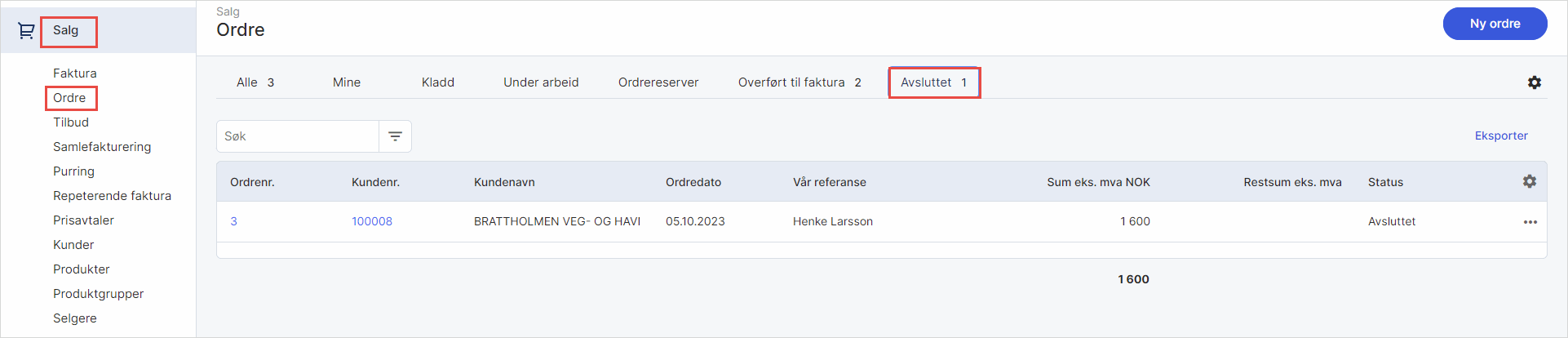 - Velg fanen Avsluttet og velg aktuell ordre.