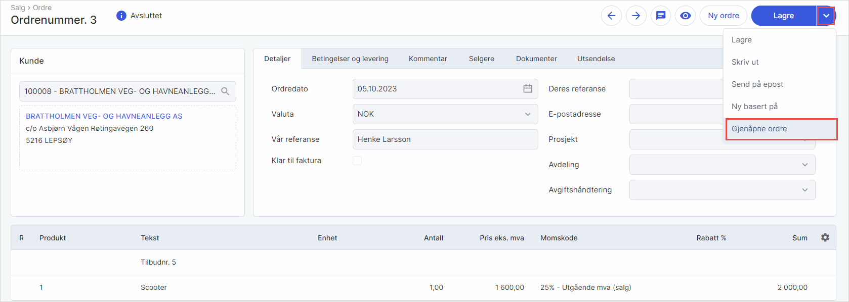 - Klikk på pilen ved Lagre og velg Gjenåpne ordre.