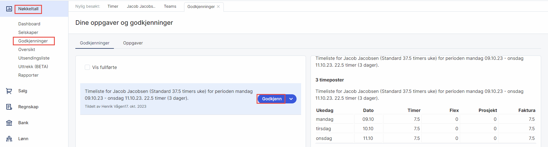 1. Gå til Nøkkeltall i venstremenyen og velg Godkjenninger. Her kan du Godkjenne eller Avvise timelisten. Dersom du avviser vil ikke timelisten bli låst, og personen kan endre timene.