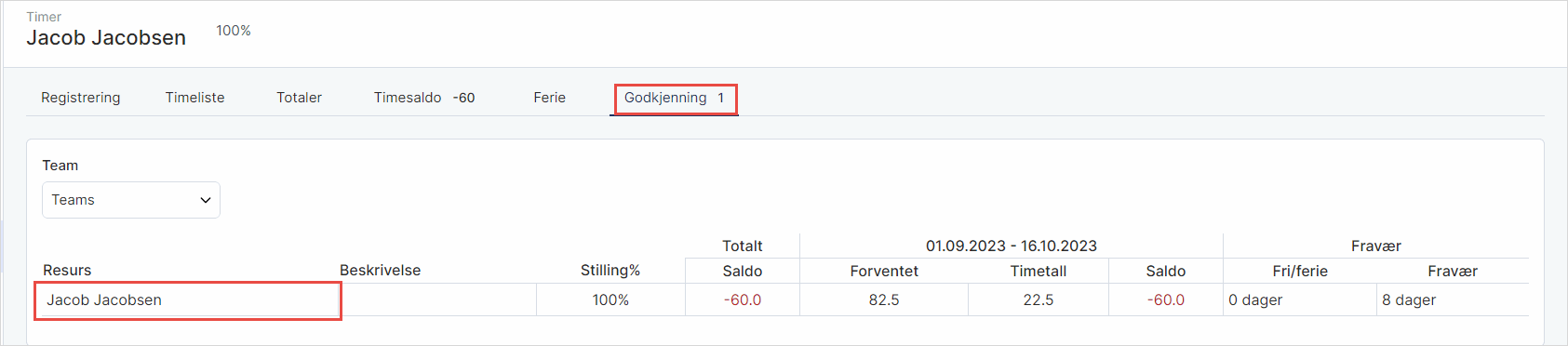2. Gå til fanen Godkjenning. Dersom du er teamleder for flere team, velger du riktig team i nedtrekkslisten. Klikk på aktuell person som du skal godkjenne timer for.