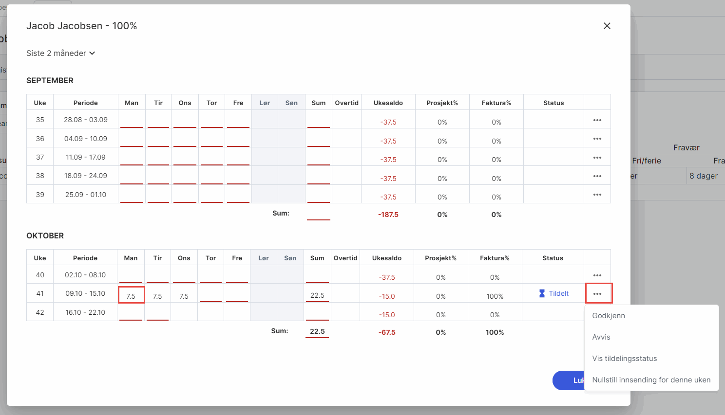 3. Innsendte uker vil ha status Tildelt. Ved å klikke på de tre kulepunktene til høyre får du fire valg: Godkjenne, Avvis, Vis tildelingsstatus og Nullstill innsending for denne uken. Ønsker du en detaljert oversikt over timene en gitt dag, klikker du på ruten som indikerer timetallet for denne dagen.