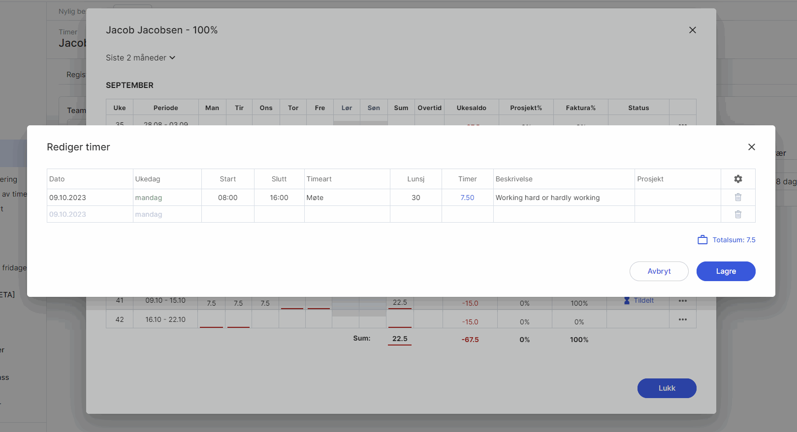 4. Har du valgt å se detaljene for en gitt dag, vil følgende vindu åpne seg. Herfra kan du redigere timene for denne dagen.